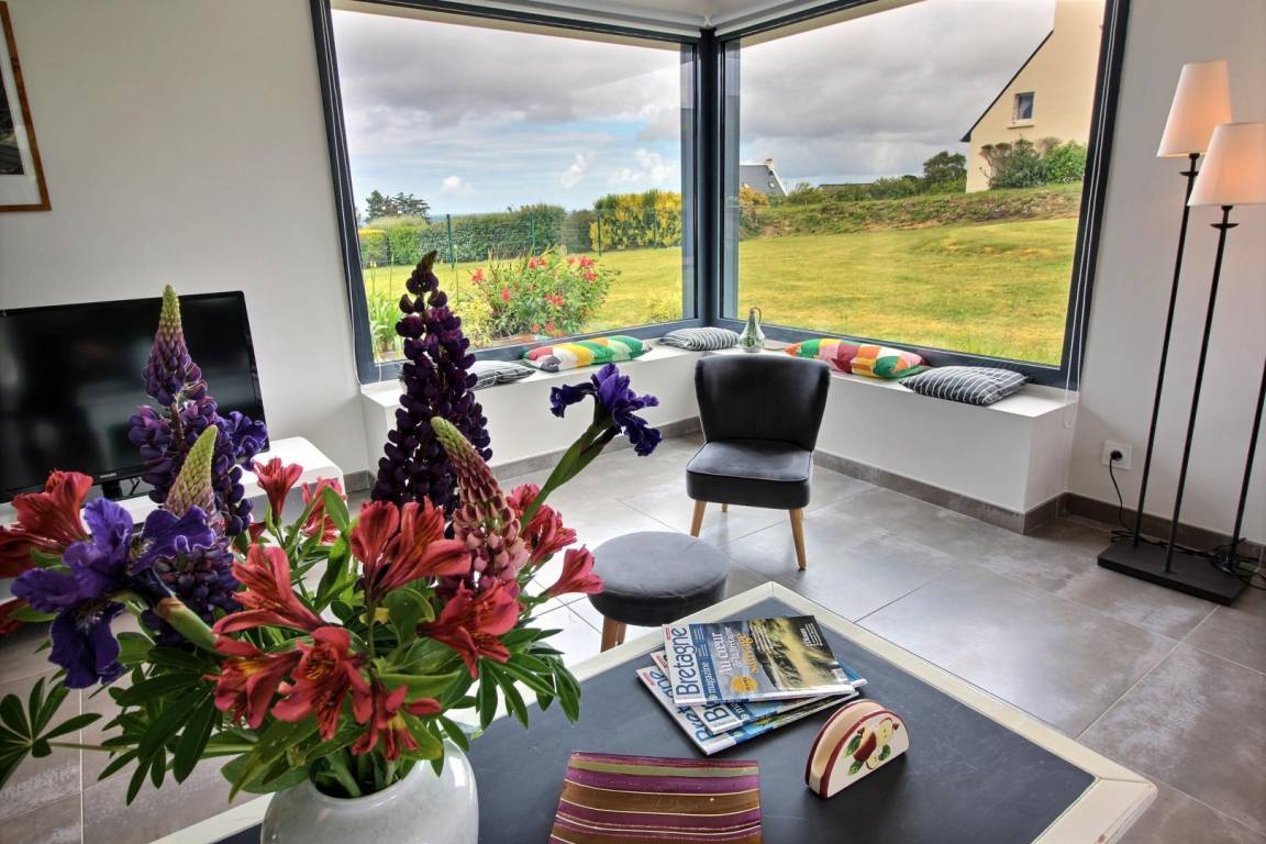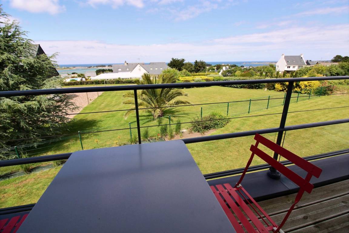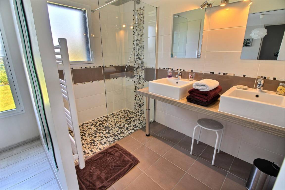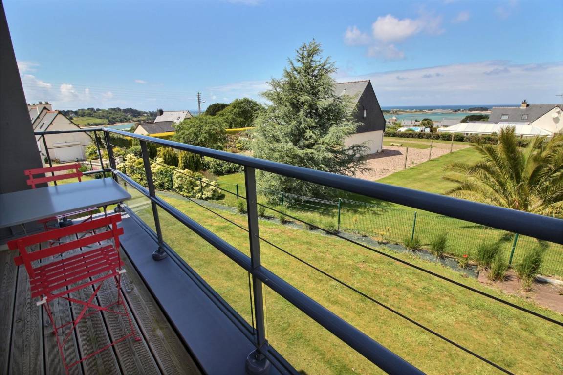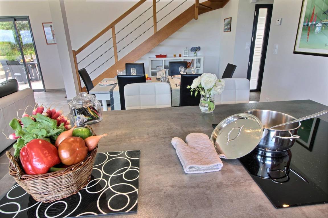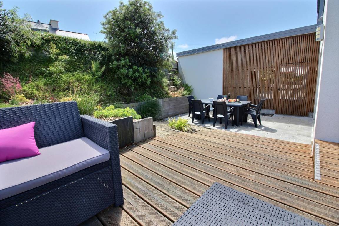 Ihre Ferienwohnung umfasst: Ausgestattete Küche mit Kochinsel, geräumiges Wohnzimmer und Lounge (USB-Flachbildfernseher) Holzofen. Wäschekammer. 1 Schlafzimmer (1 Doppelbett 160x200 mit eigenem Bad), 1 Schlafzimmer (1 Doppelbett 160x200), 1 Schlafzimmer (2 Einzelbetten 90x190, die zusammengestellt werden können), Badezimmer mit Dusche, 2 separate Toiletten. Zwischengeschoss und Terrasse im Obergeschoss mit Blick auf die Inseln. 800 m² großer Garten mit 2 Terrassen. Parkplatz und Hof für Autos, Abstellraum für Fahrräder oder Motorräder.