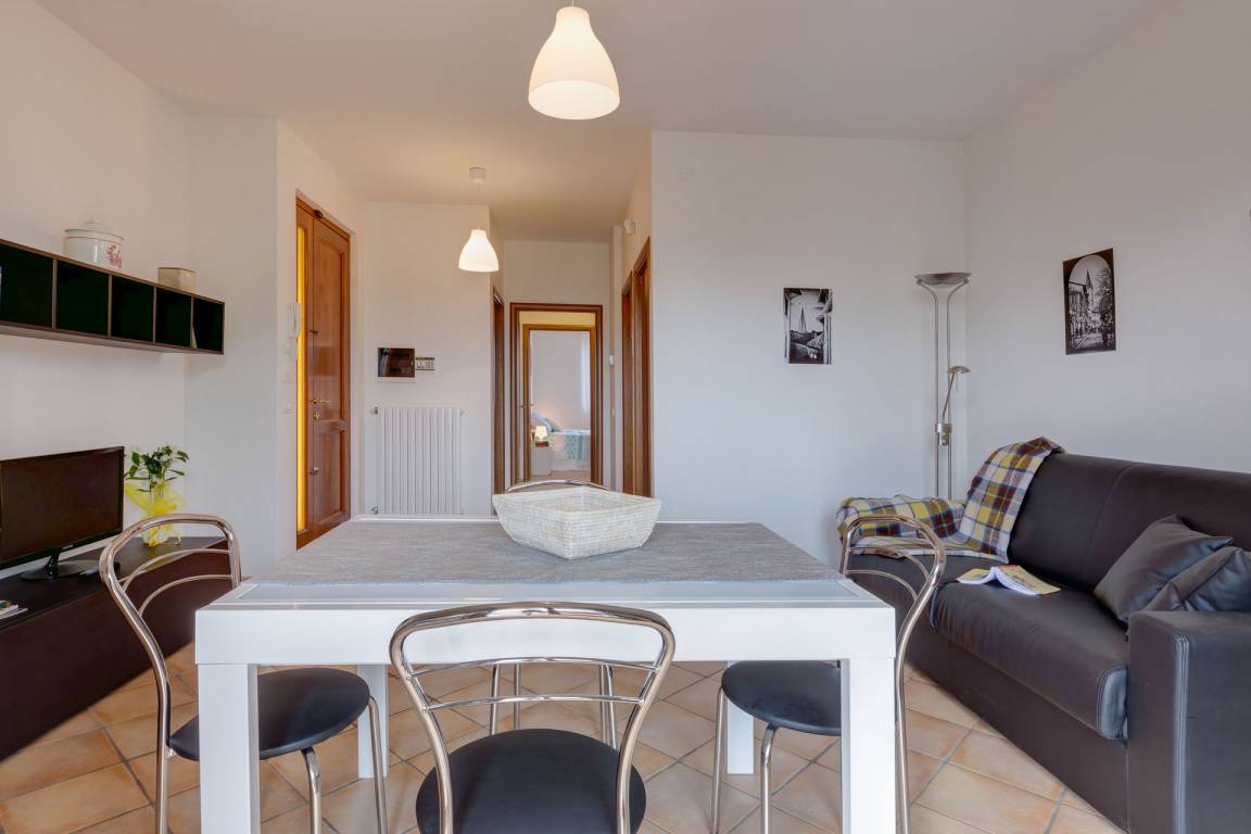 Wohnzimmer: Esstisch (Personen: 6), Doppel-Schlafsofa, WiFi Internet, Klimaanlage, TV, Ausgang auf den Balkon.