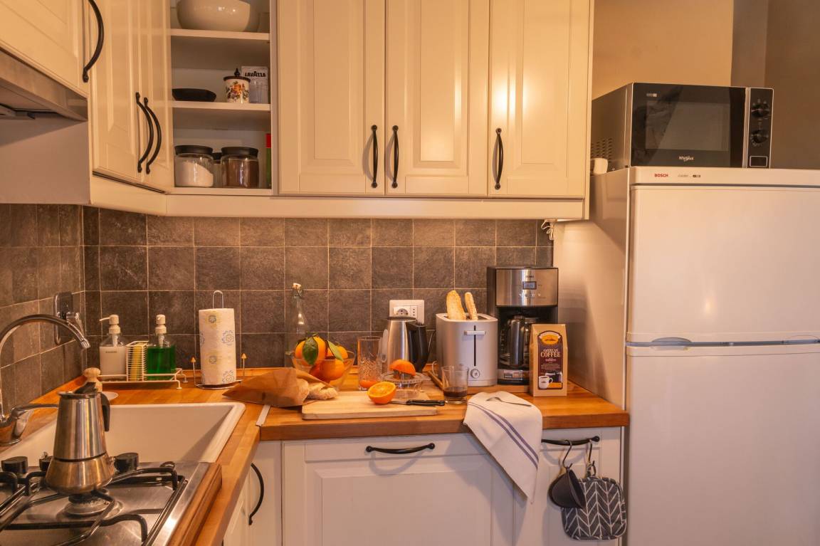 Die moderne Küche verfügt über Kühlschrank mit Tiefkühler, Herd und Elektroofen, Spülmaschine, Mikrowelle, Kaffeemaschine, sowie einen großen, alten Esstisch für bis zu 5 Personen.