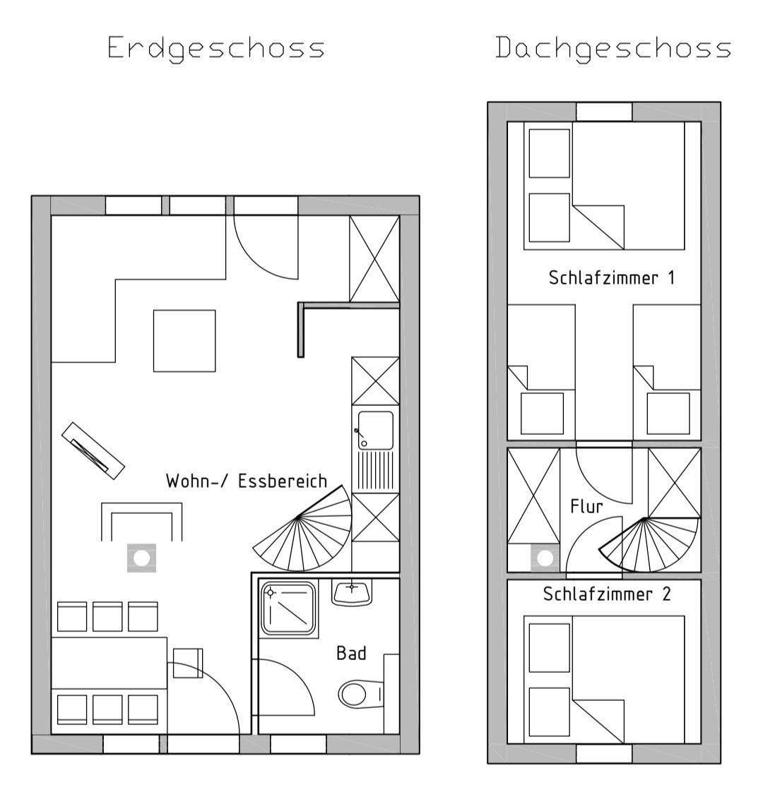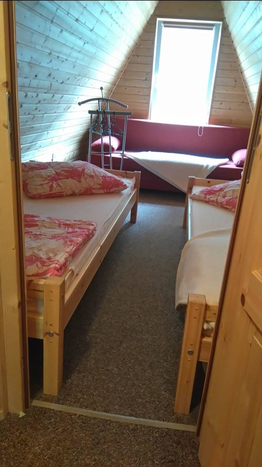 Im Obergeschoss ist ein Zimmer mit 2 Einzelbetten und einer Couch welche Umgeklappt für 2 Personen Platz zum schlafen hat.