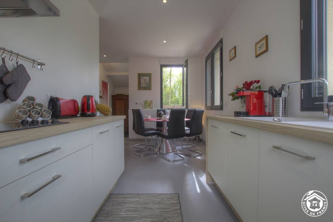 Auf dem Gelände der Domaine de La Rouge, in der Nähe der mittelalterlichen Stadt Pérouges, bietet die Grabotier gîte, ein unabhängiges Haus von 80 m², Platz für 6 Personen. Helligkeit, Komfort und Wohlbefinden sind die Schlüsselwörter dieses Ortes, wir sind weit entfernt von diesem ehemaligen Grabot-Lagerplatz ... Frédéric und Marie Victoire, Ihre Gastgeber erzählen Ihnen gerne, wenn Sie es wünschen, von der gewaltigen Transformation von dieses Gebäude.. Die Eingangshalle bietet Zugang zum Essbereich und seiner modernen Einbauküche mit vielen Fenstern, um die umliegende Landschaft zu genießen. Eine Stufe weiter unten, auf einem polierten Betonboden, lädt ein Wohnzimmer mit moderner, raffinierter Dekoration zum Entspannen in der Nähe dieses großen Erkerfensters ein, das Zugang zur Terrasse oder im Sommer unter den Bäumen bietet. Vom Flur aus haben Sie die Wahl mit seinen 3 personalisierten Schlafzimmern: zwei Schlafzimmer, eines "rot" das andere türkis, bieten jeweils zwei 90 * 200 Bett