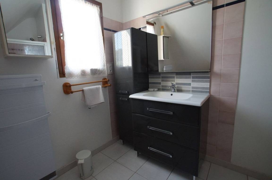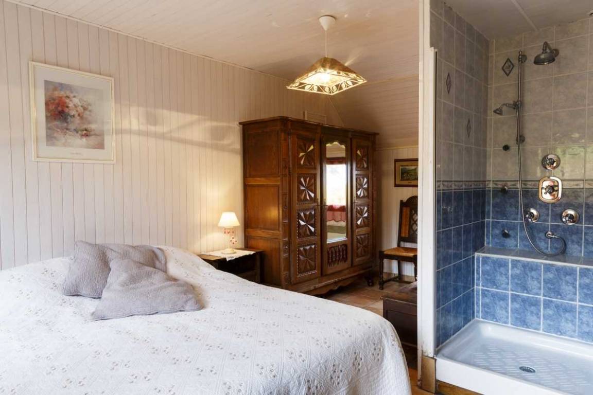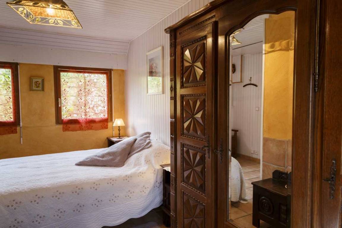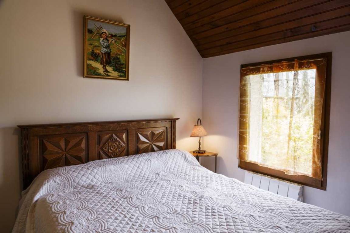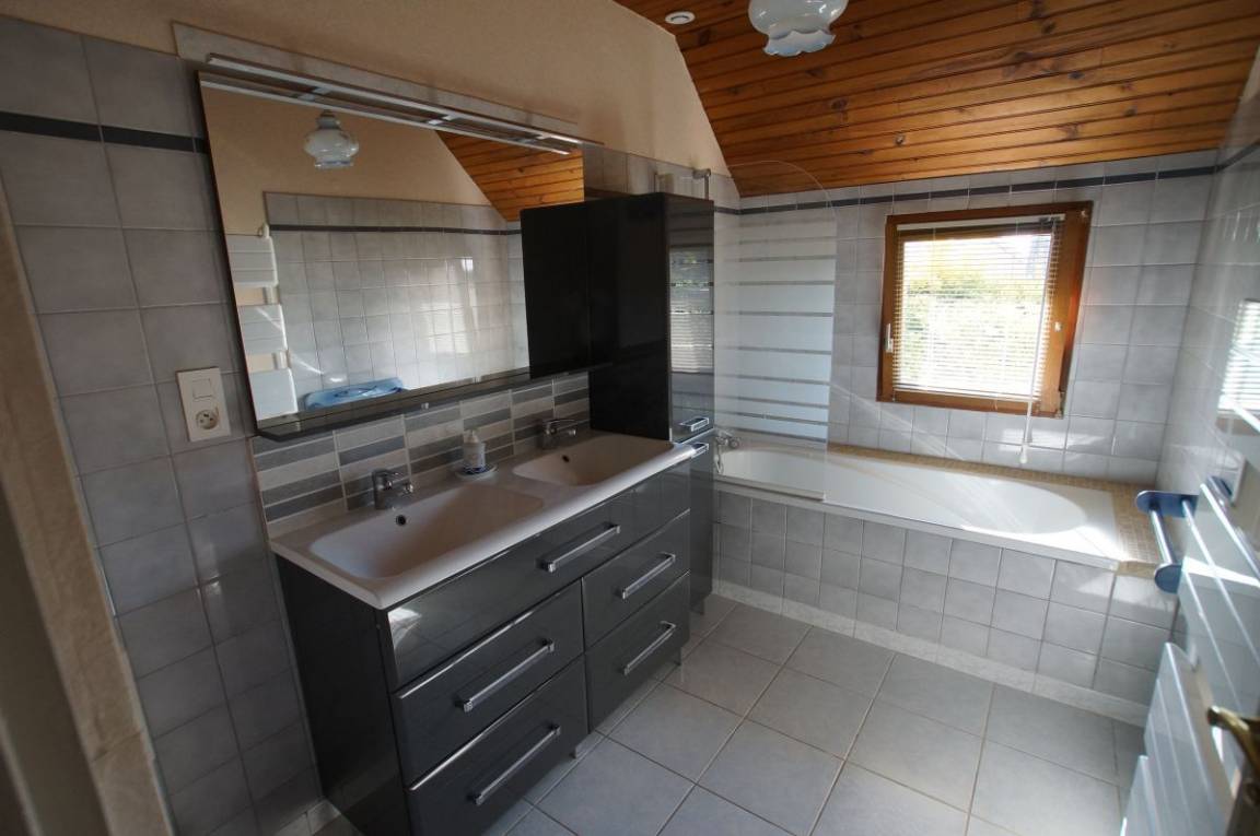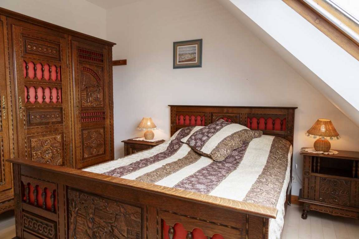 Etage: 2 angrenzende Schlafzimmer, getrennt durch eine Luftschleuse, 1 Schlafzimmer (1 140x190-Bett), 1 Schlafzimmer (2 90x190-Betten), Badezimmer mit Badewanne, WC. 1 Hauptschlafzimmer (160x200) mit Badezimmer (Badewanne) und eigenem WC.