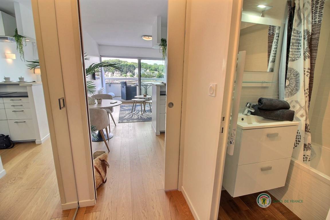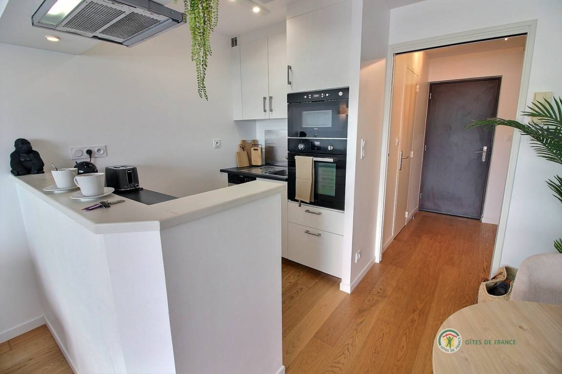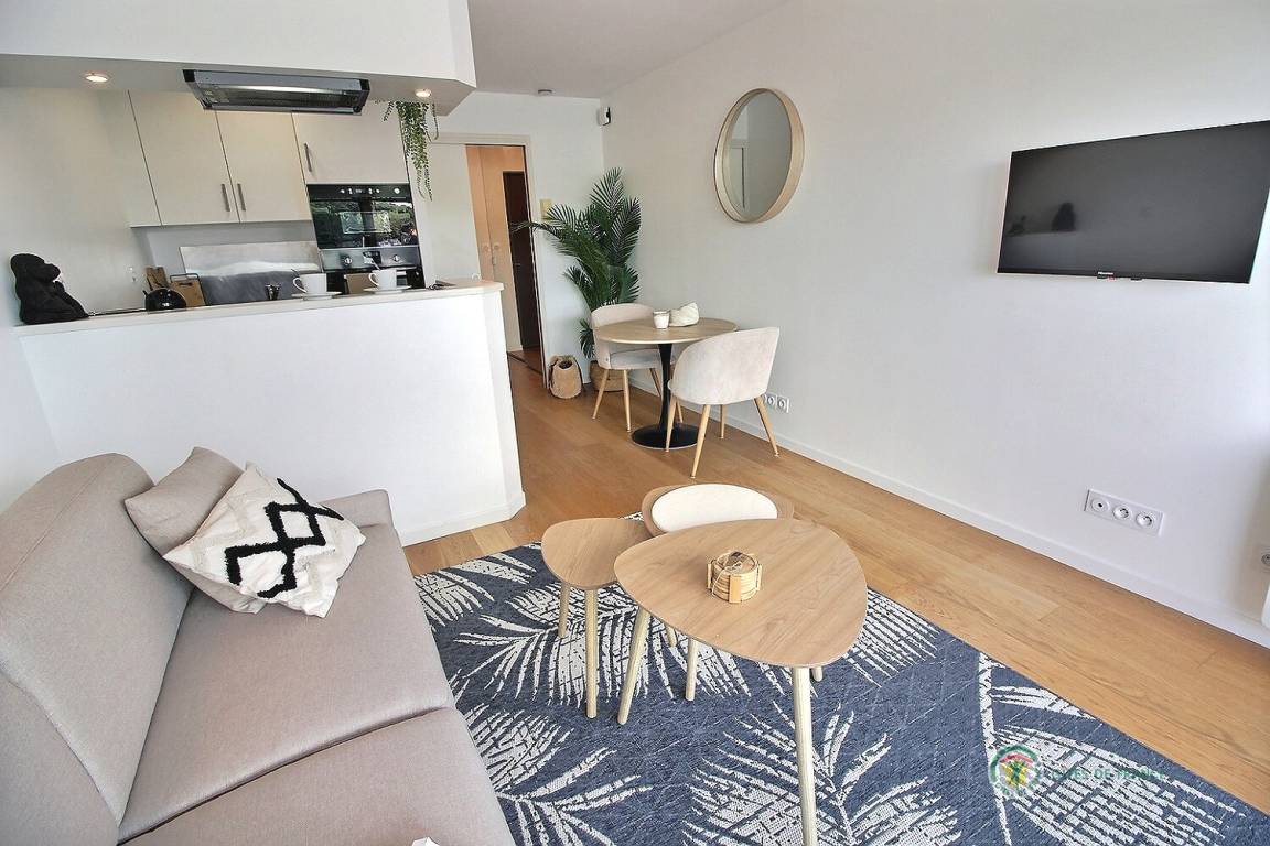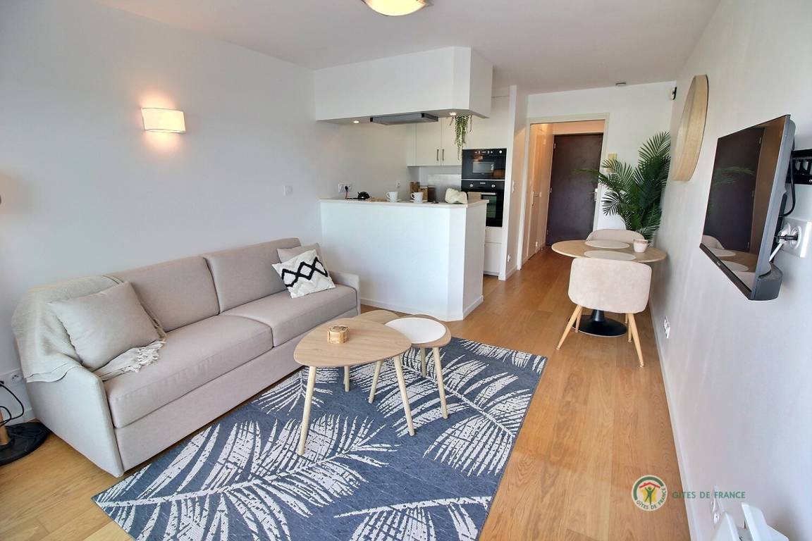 Willkommen in diesem Studio im 3. Stock mit Aufzug in der Residenz Bellevue: Eingangshalle mit großem Schrank, der zu einer Einbauküche führt, ein Wohnzimmer, ein Wohnzimmer mit einem Schlafsofa (160 x 200), das auf eine 5 m² große Terrasse mit Aussicht führt des Miniaturhafens von Linkin, Badezimmer mit Badewanne + Duschvorhang und WC. Parken auf dem öffentlichen Parkplatz vor dem Gebäude. Eingangstür mit Digicode.