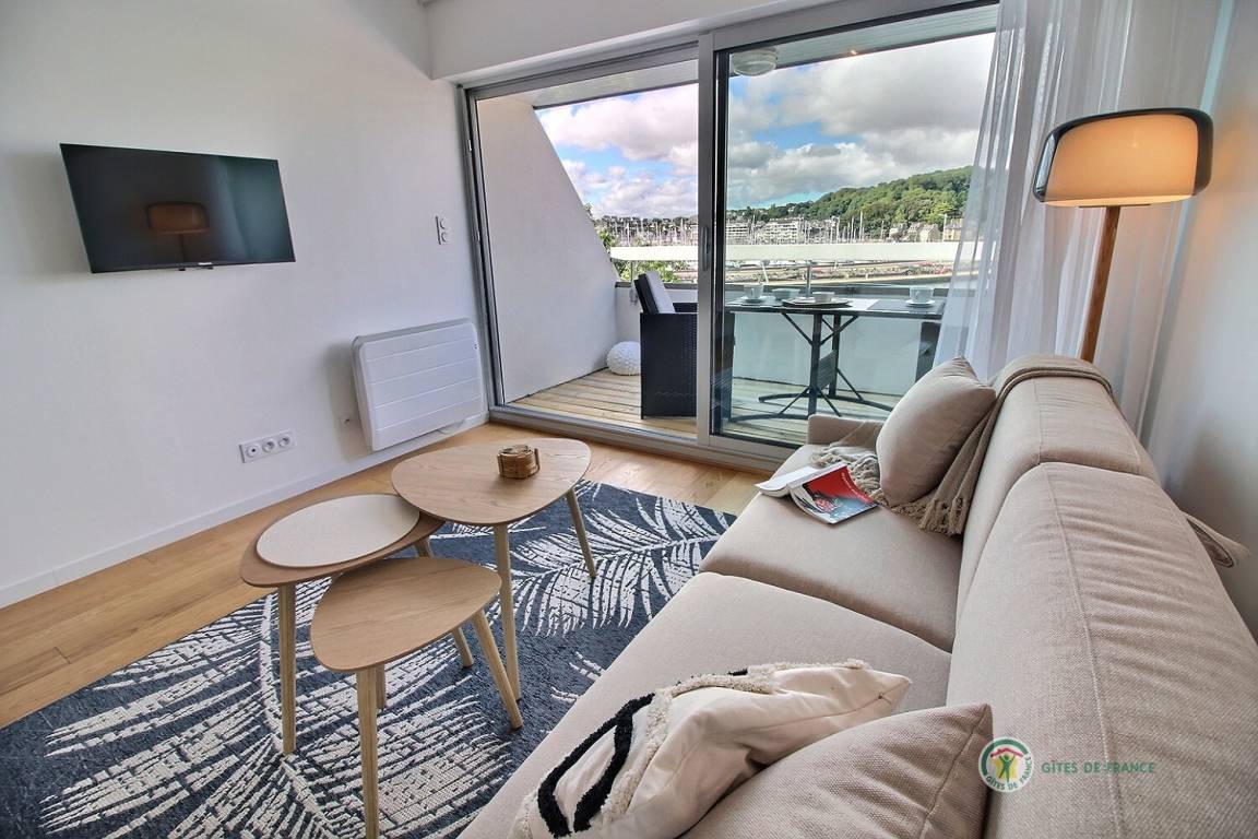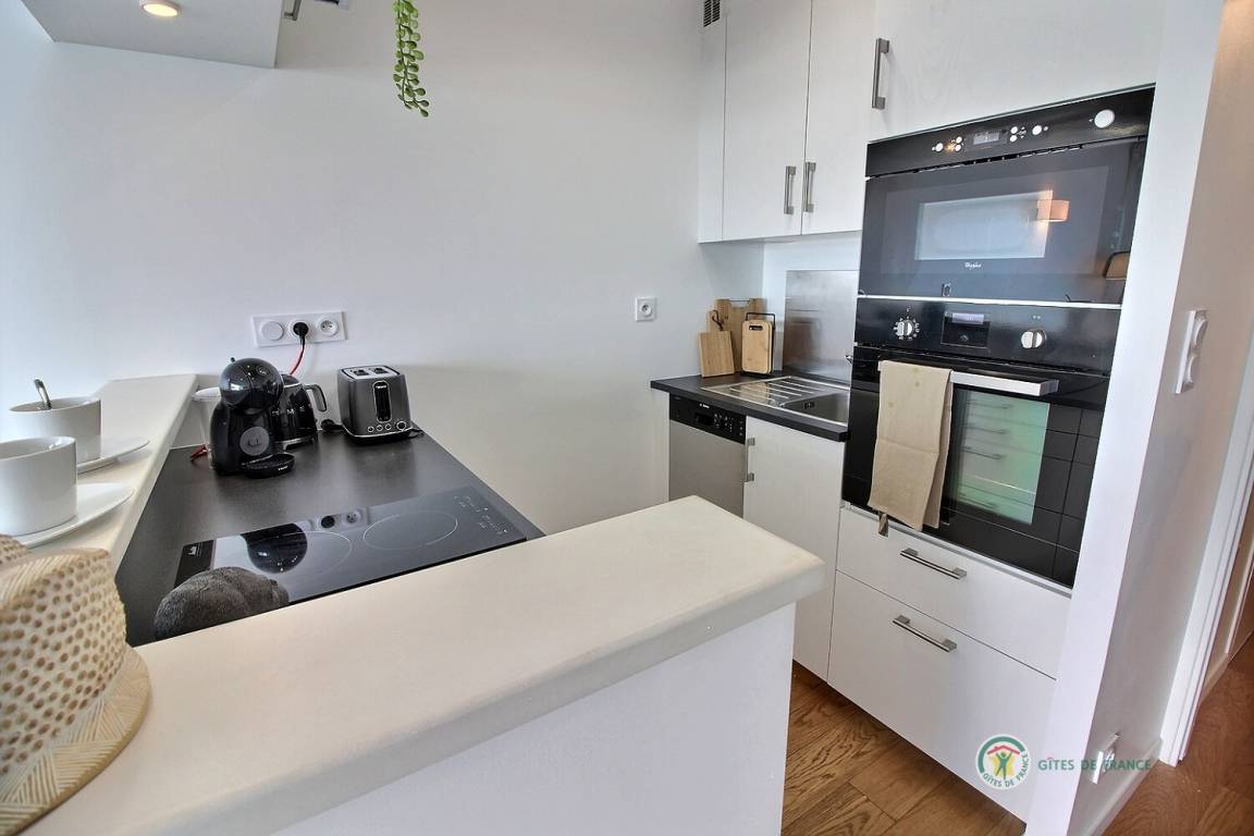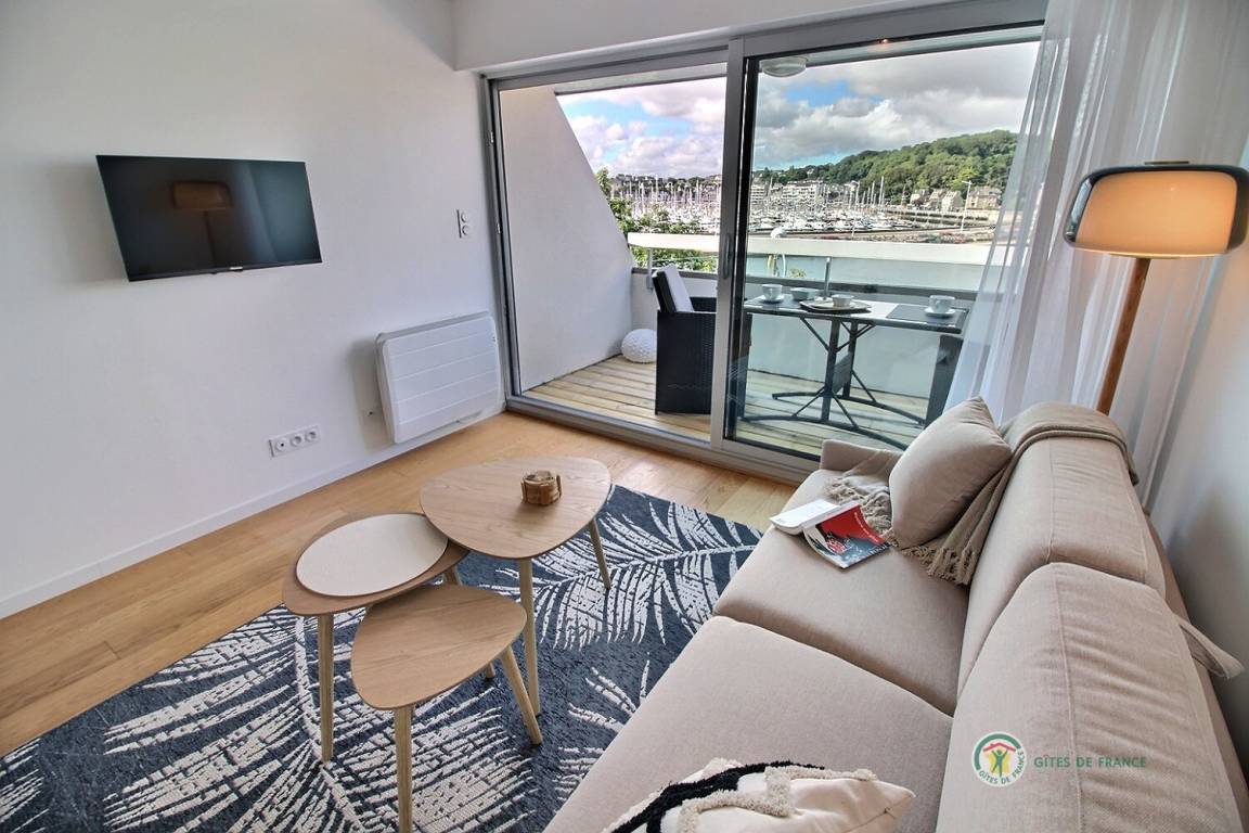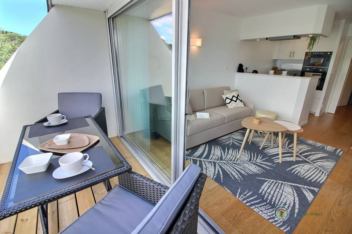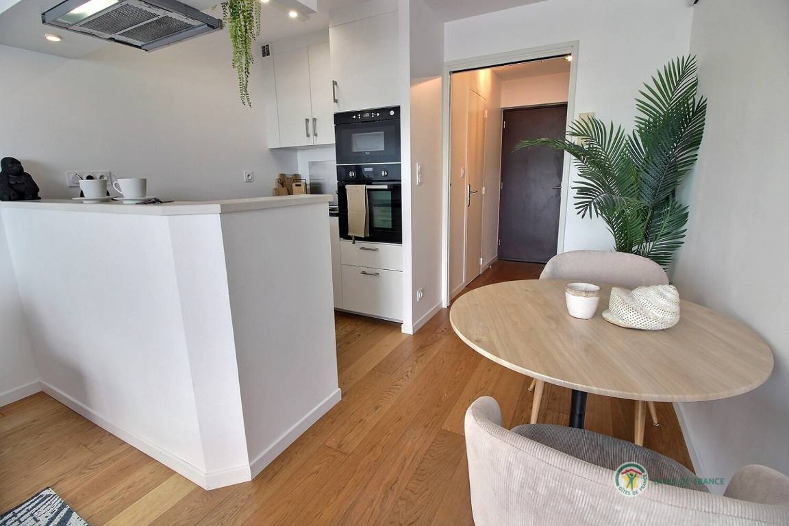 Willkommen in diesem Studio im 3. Stock mit Aufzug in der Residenz Bellevue: Eingangshalle mit großem Schrank, der zu einer Einbauküche führt, ein Wohnzimmer, ein Wohnzimmer mit einem Schlafsofa (160 x 200), das auf eine 5 m² große Terrasse mit Aussicht führt des Miniaturhafens von Linkin, Badezimmer mit Badewanne + Duschvorhang und WC. Parken auf dem öffentlichen Parkplatz vor dem Gebäude. Eingangstür mit Digicode.