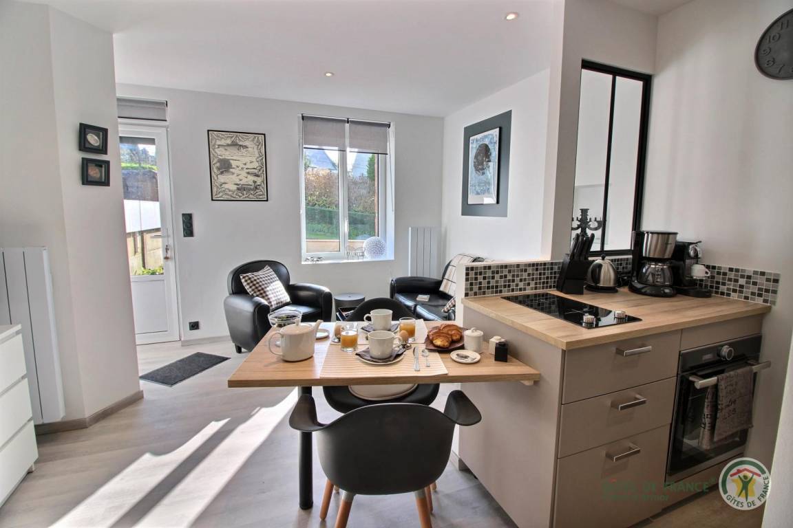 Ihre Ferienwohnung umfasst im Erdgeschoss: ein Wohnzimmer mit Zugang zur Einbauküche (2 Ceranfelder), ein Duschbad, eine Toilette mit Waschbecken und eine Waschküche. Im Obergeschoss ein großes Schlafzimmer mit einem 180 cm breiten Bett (dieses kann auf Anfrage in zwei Teile geteilt werden). In dem nach Süden ausgerichteten Landschaftsgarten von ca. 200 m² genießen Sie eine Terrasse, eine Entspannungslounge sowie Liegestühle. Ein privater, geschlossener Standort wird Ihr Fahrzeug unterbringen, dasselbe gilt für Ihre Fahrräder, ein geschlossener Raum ist mit Steckdosen ausgestattet, die Ihnen zur Verfügung stehen. Reihenhaus hat ein anderes Haus, das selten bewohnt wird.