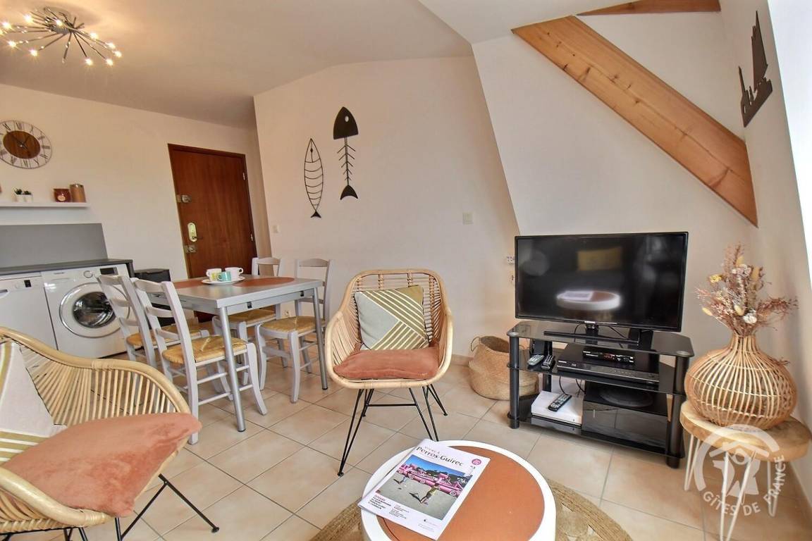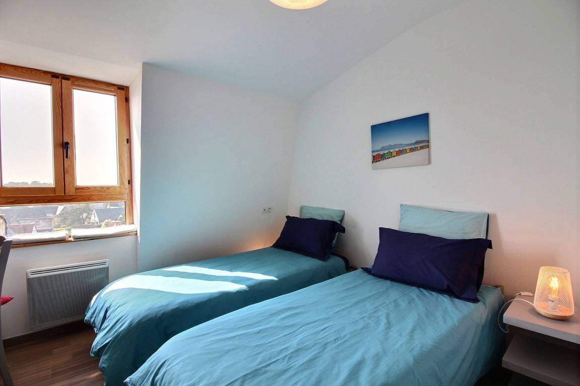 Ihre Ferienwohnung im 3. Stock mit Aufzug einer kleinen Residenz umfasst: ein Wohnzimmer mit Küchenbereich, ein Schlafzimmer mit einem 160x200-Bett und ein Schlafzimmer mit zwei 80x190-Betten, die auf Wunsch zusammengestellt werden können, ein Badezimmer mit Badewanne, ein separates WC , ein Flur mit Vorraum. Von den 3 Haupträumen: schöne Aussicht auf Ploumanac'h, seine Gezeitenmühle, seinen Hafen und die Burg von Costaeres. Ihr privater Parkplatz befindet sich 50 m hinter der Residenz.
