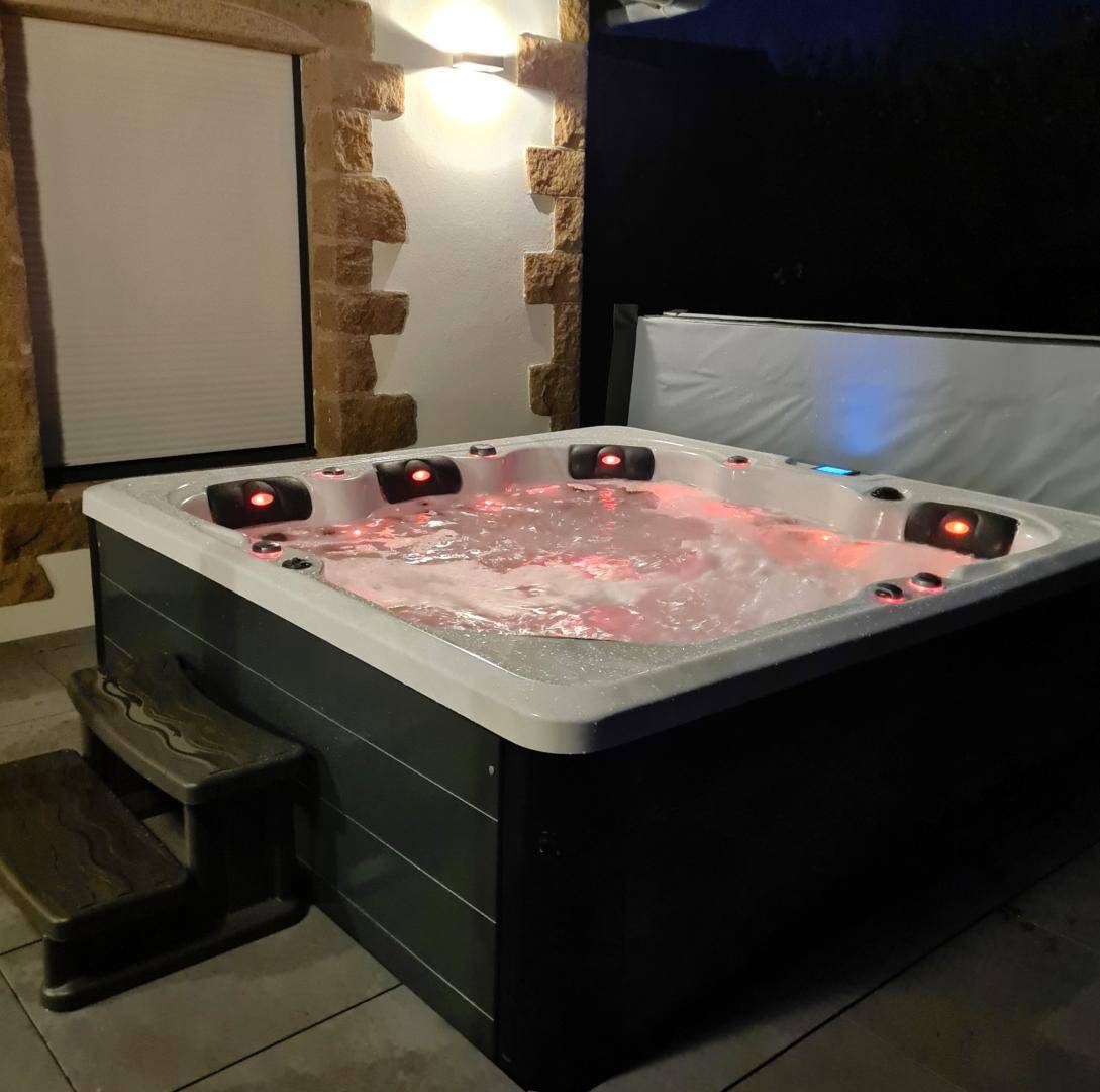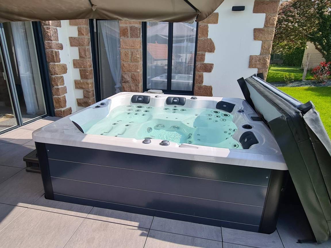 - Südostseite: ein privater, umzäunter Landschaftsgarten von 225 m² mit einer großen, gepflasterten Terrasse von 34 m² und einem Whirlpool für 6 Personen,