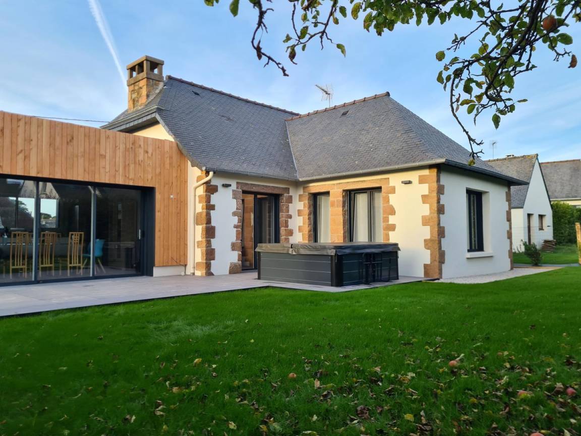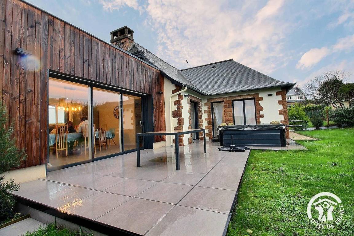 In ruhiger Lage im Stadtzentrum, in den Hügeln oberhalb von Perros-Guirec, besticht dieses wunderschöne Haus durch seine gelungene Verbindung von Alt und Neu. Der Whirlpool für sechs Personen auf der nach Südosten ausgerichteten Terrasse ist einfach traumhaft! Der kürzlich erfolgte Anbau durchflutet das Haus mit Tageslicht. Ihr Auto können Sie im Carport parken. In nur zehn Gehminuten erreichen Sie die Geschäfte im Stadtzentrum, den Markt, den Hafen, die Strände, den Aussichtspunkt und den Wanderweg GR34. Nutzen Sie doch die Buslinie Macareux oder mieten Sie sich ein Fahrrad am 1,5 km entfernten Hafeneingang. Für etwas Abwechslung sorgen das nur 2 km entfernte Casino und das Thalassotherapiezentrum. Unternehmen Sie doch einen Bootsausflug zum Archipel der Sept-Îles – ein unvergessliches Erlebnis inmitten von Meer und Vogelwelt!