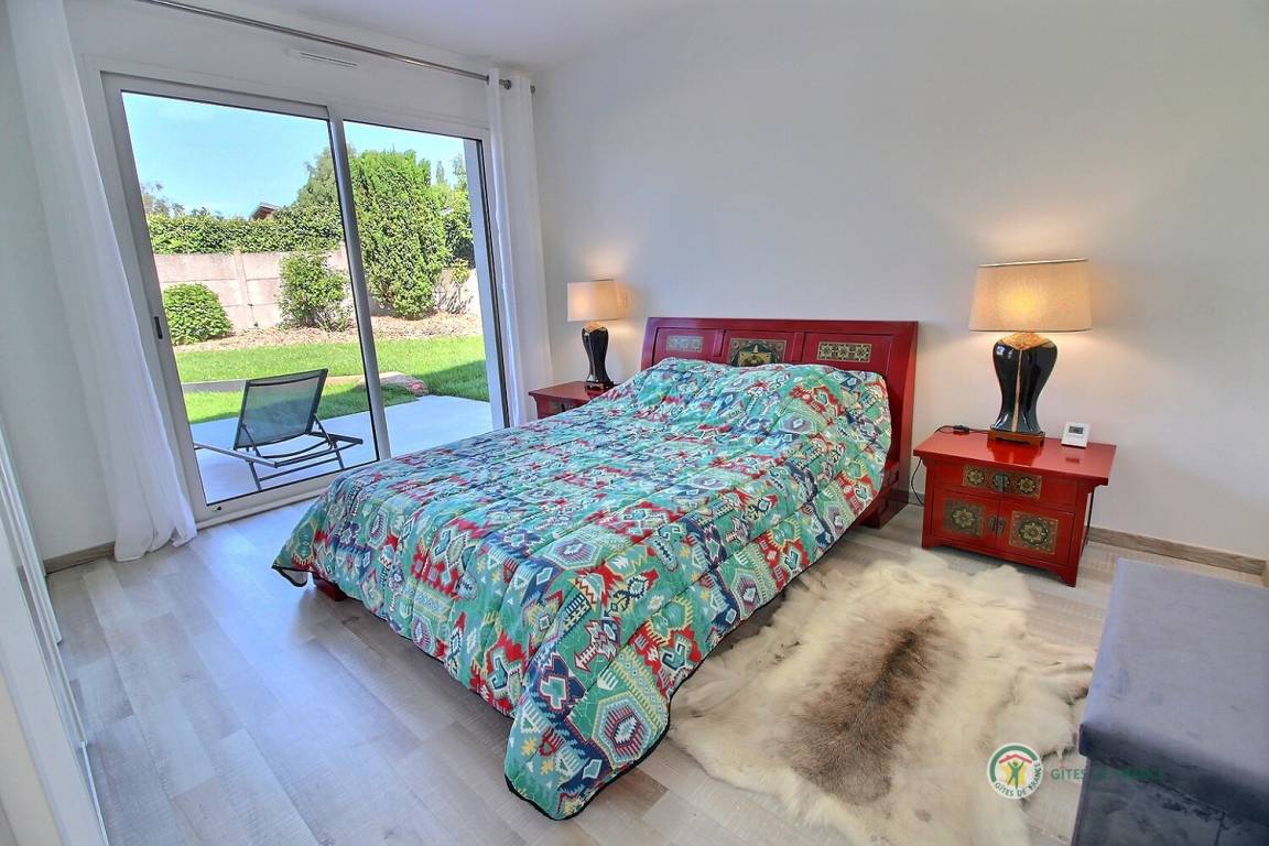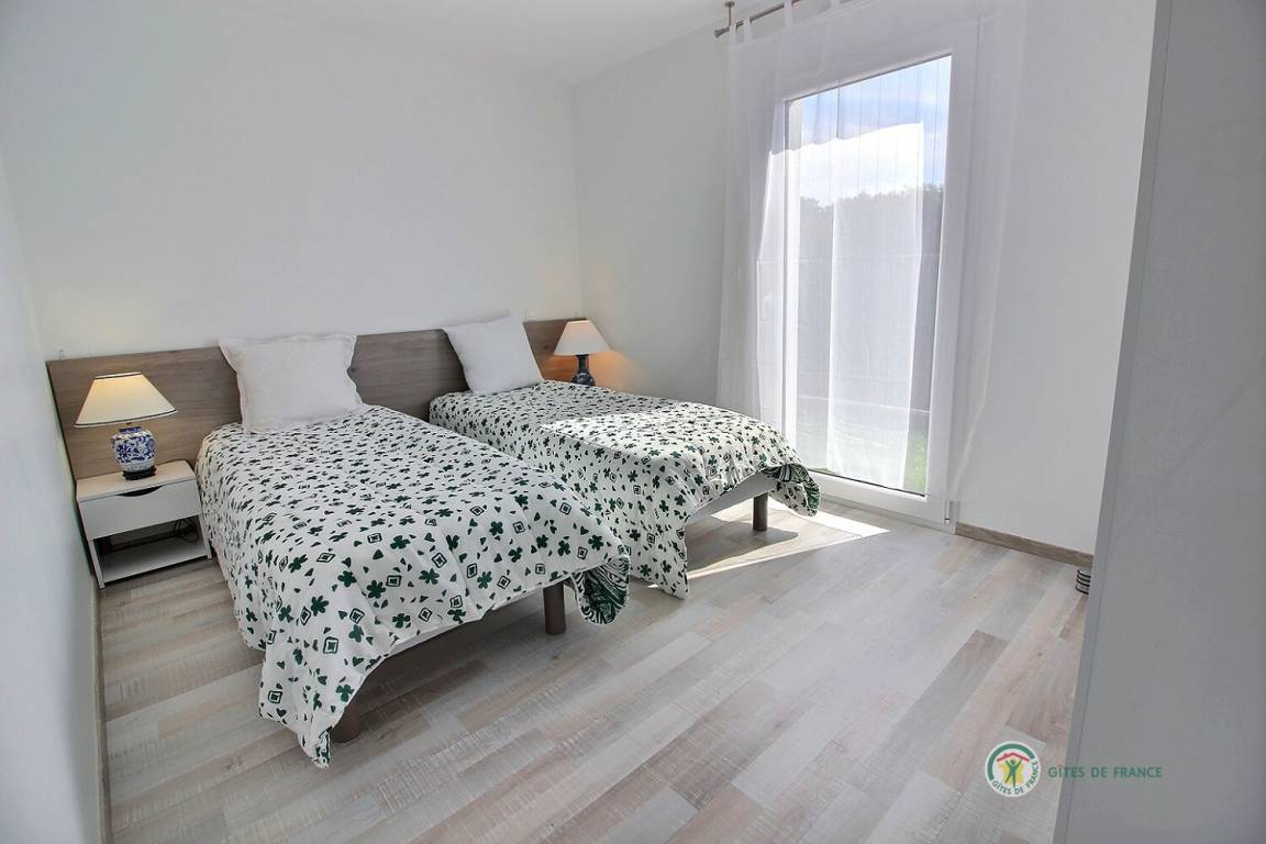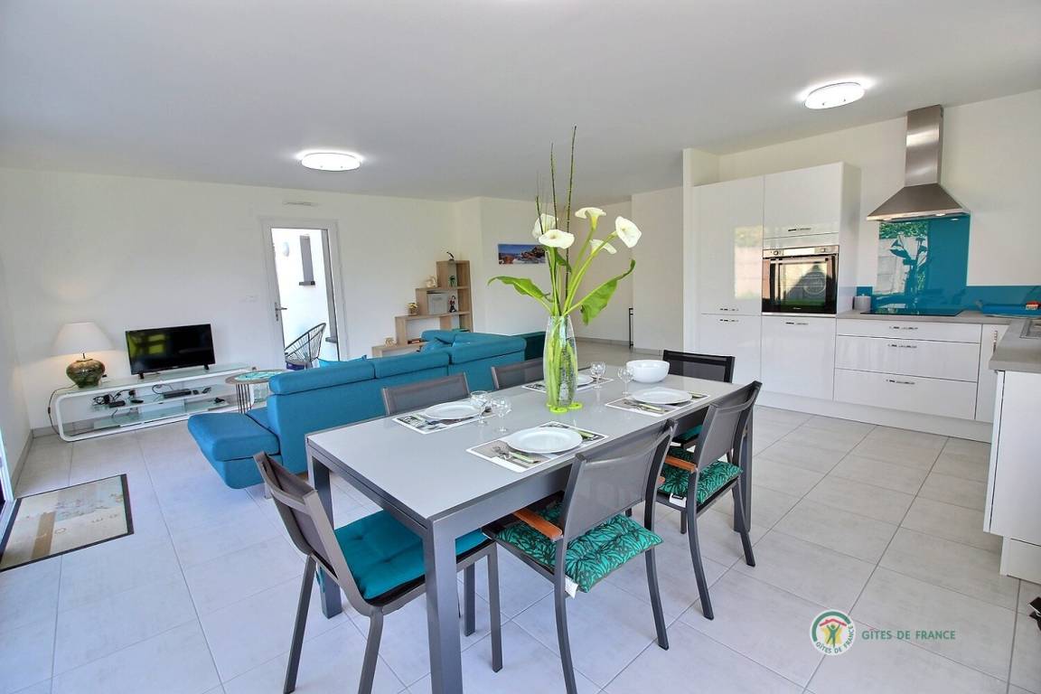 Ihre einstöckige Ferienwohnung beinhaltet: Ein großer Gemeinschaftsraum mit Einbauküche und Wohnzimmern mit großen Fenstern auf die große Terrasse zu öffnen und den Garten, separates WC mit Waschbecken, Waschküche, 2 Schlafzimmer, eines mit 1 Bett 140x190 und den anderen mit 2 Betten 80x200, Badezimmer mit Dusche, ein idealer Büroraum für Telearbeit.