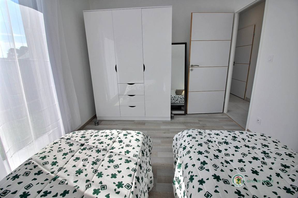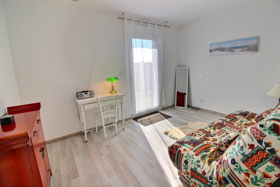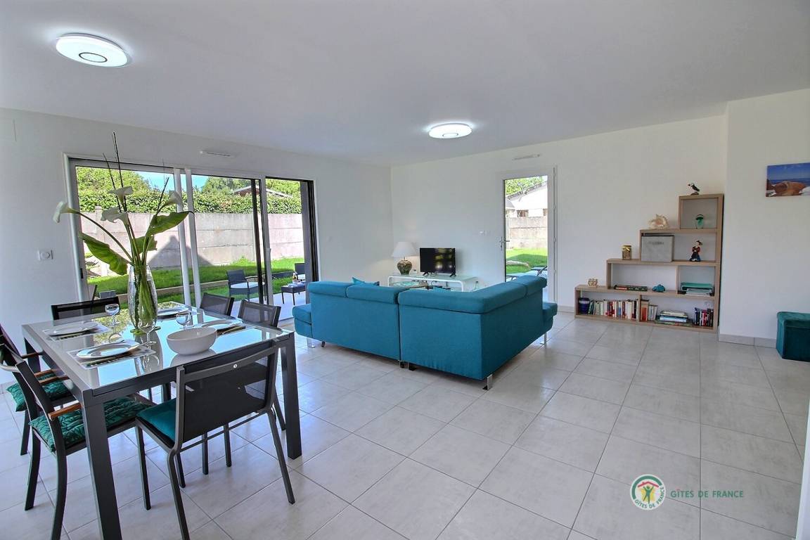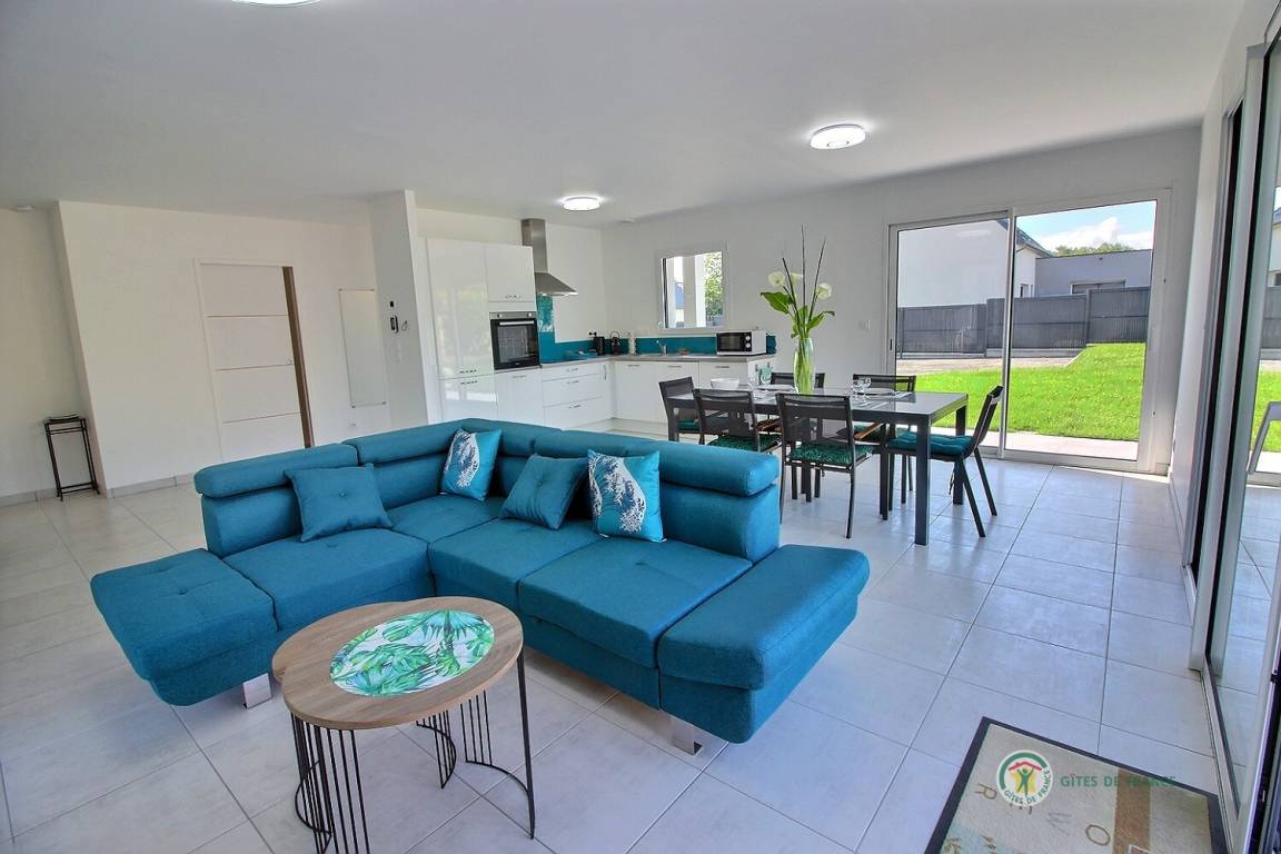 Ihre einstöckige Ferienwohnung beinhaltet: Ein großer Gemeinschaftsraum mit Einbauküche und Wohnzimmern mit großen Fenstern auf die große Terrasse zu öffnen und den Garten, separates WC mit Waschbecken, Waschküche, 2 Schlafzimmer, eines mit 1 Bett 140x190 und den anderen mit 2 Betten 80x200, Badezimmer mit Dusche, ein idealer Büroraum für Telearbeit.