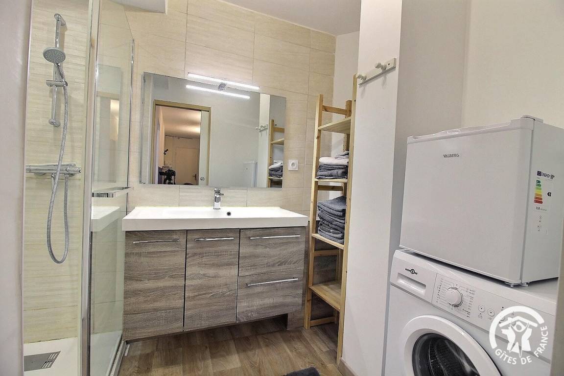 - ein Badezimmer mit Dusche, Waschbecken, Waschmaschine und kleinem Gefrierschrank,