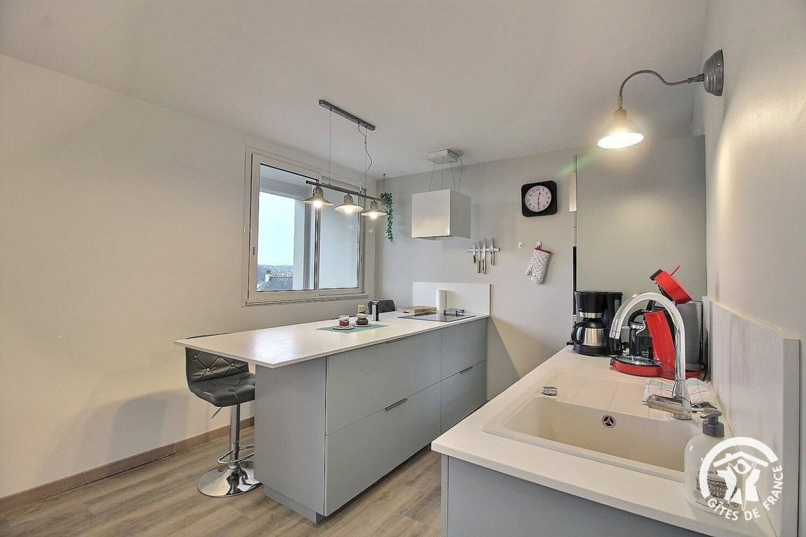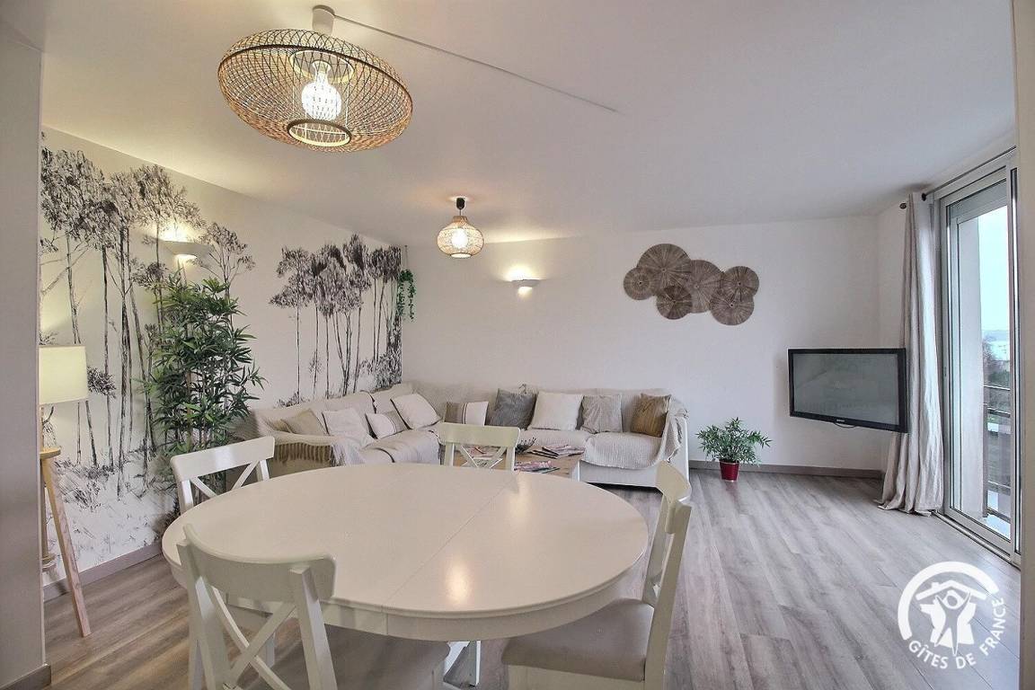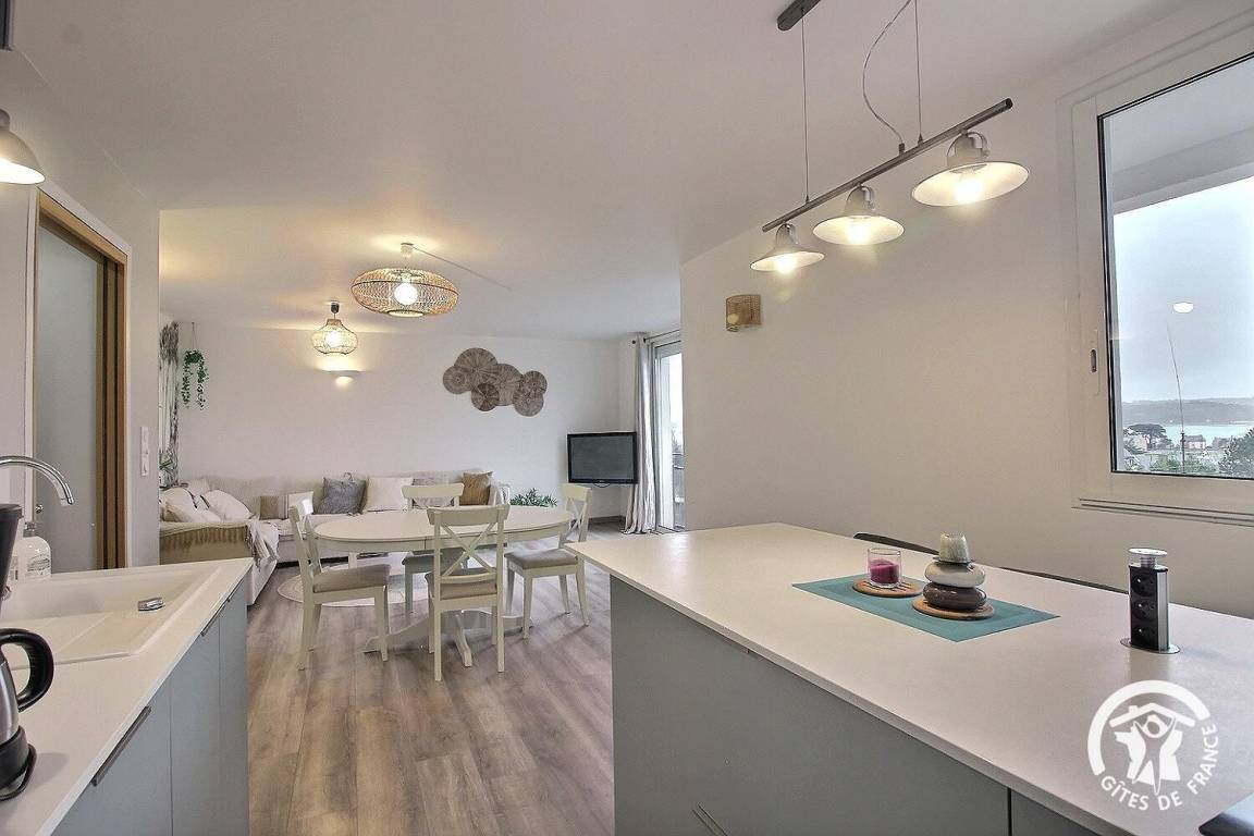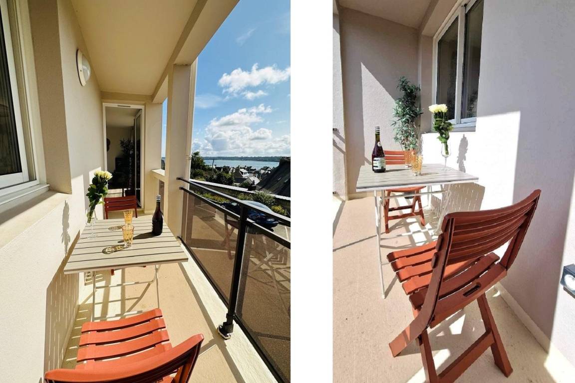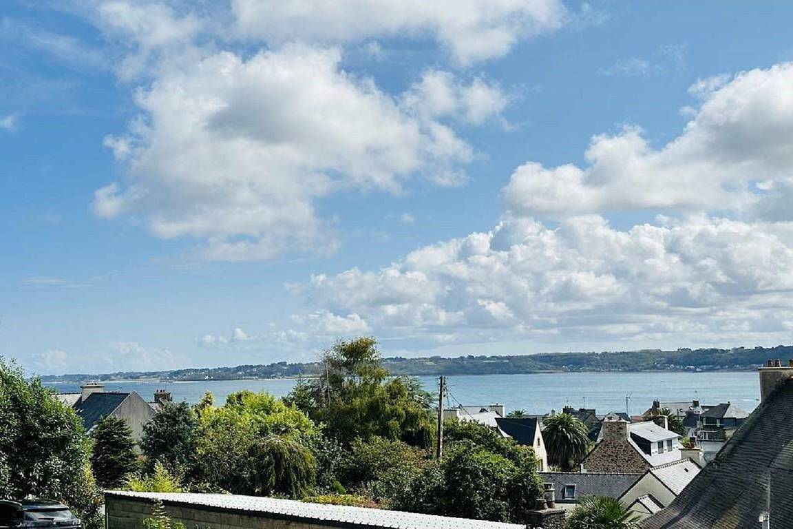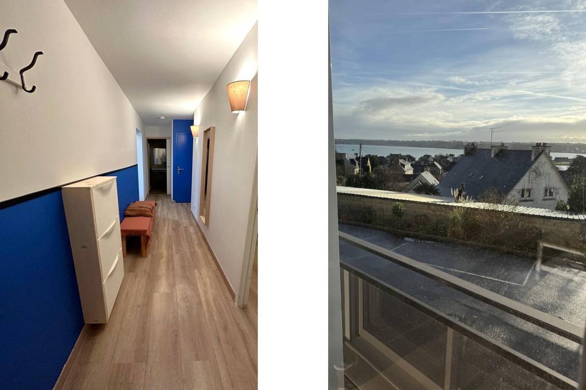- ein Wohn-/Esszimmer mit Zugang zu einer kleinen, 4,5 m² großen privaten Terrasse mit Blick auf den Hafen und die Bucht von Perros-Guirec,
