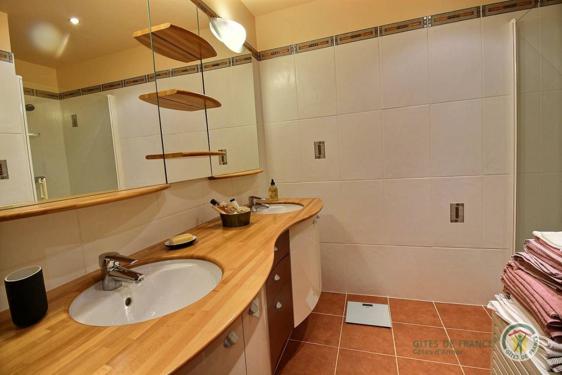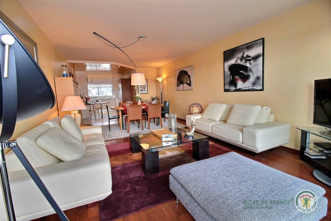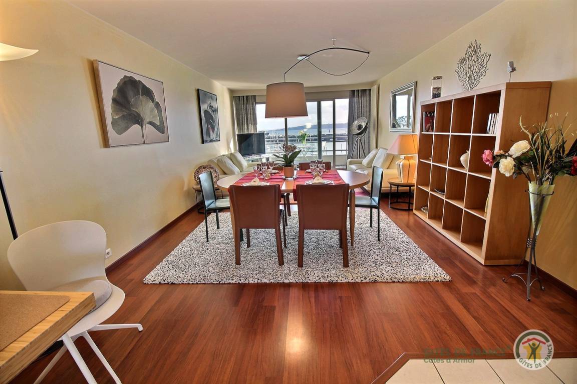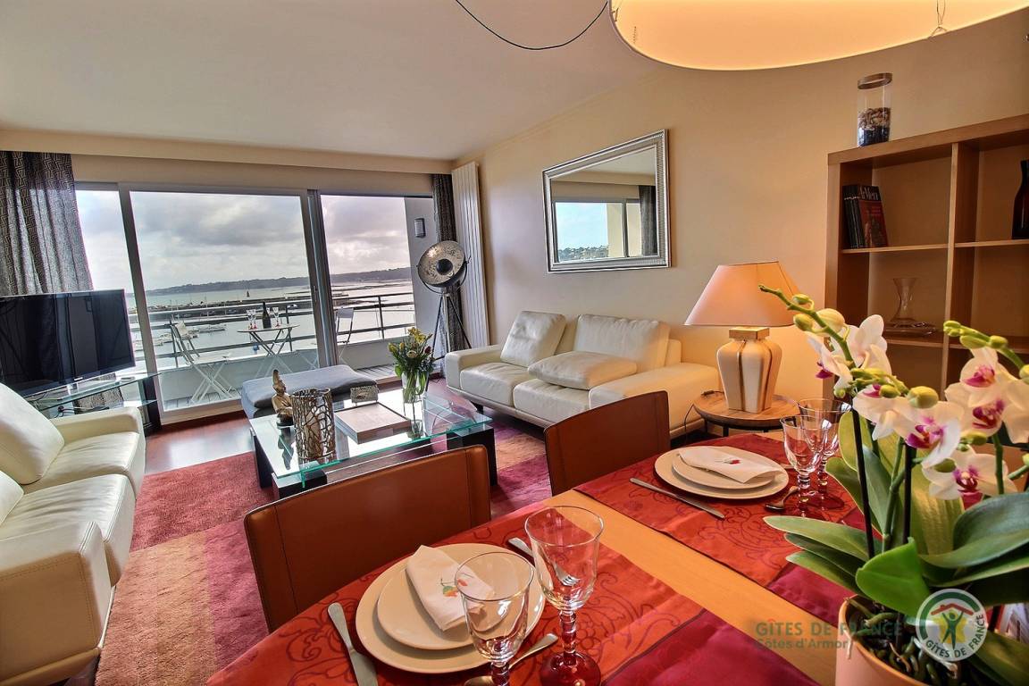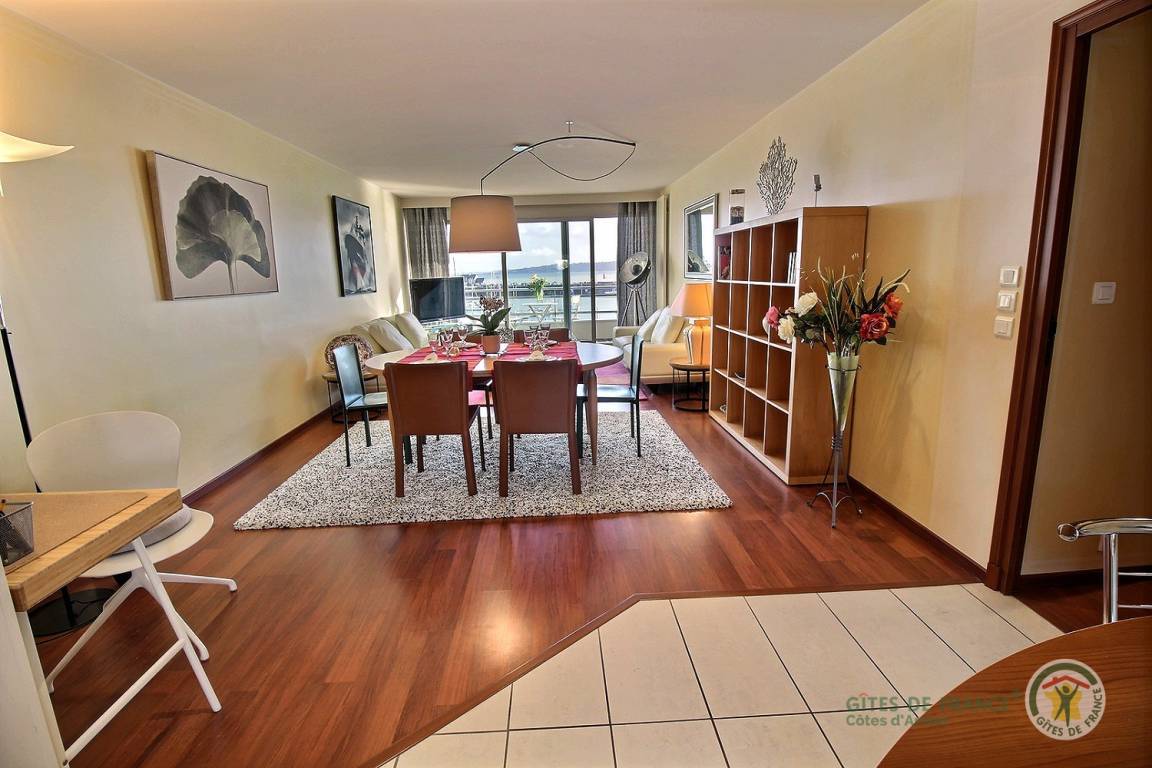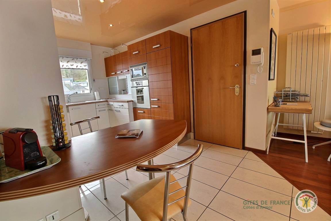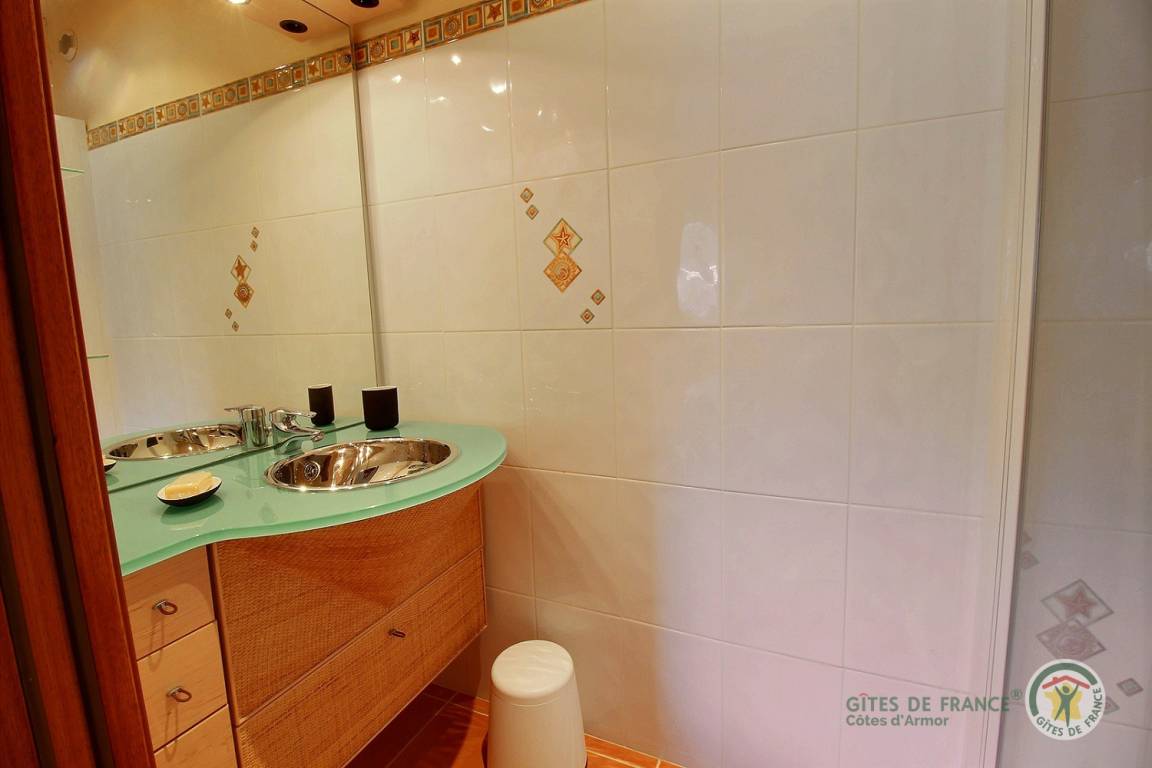 Großer Wohnraum mit Küche, Wohnzimmer, Wohnzimmer mit Blick auf den Hafen, Zugang über einen großen Flur: Badezimmer mit Dusche, separates WC mit Waschbecken, 2 Schlafzimmer: Das 1. Schlafzimmer verfügt über 1 180 x 200 cm großes Bett und verfügt über eine kleine Terrasse (Zugang). (durch das große Erkerfenster) mit Liegestühlen ausgestattet, so dass Sie den Blick auf den Yachthafen von Perros-Guirec genießen können, und das 2. Schlafzimmer mit eigenem Bad (Dusche und Waschbecken) besteht aus 2 Einzelbetten im Format 90 x 200.
