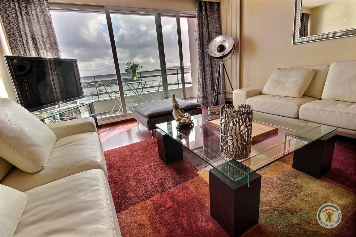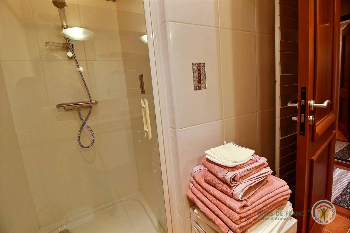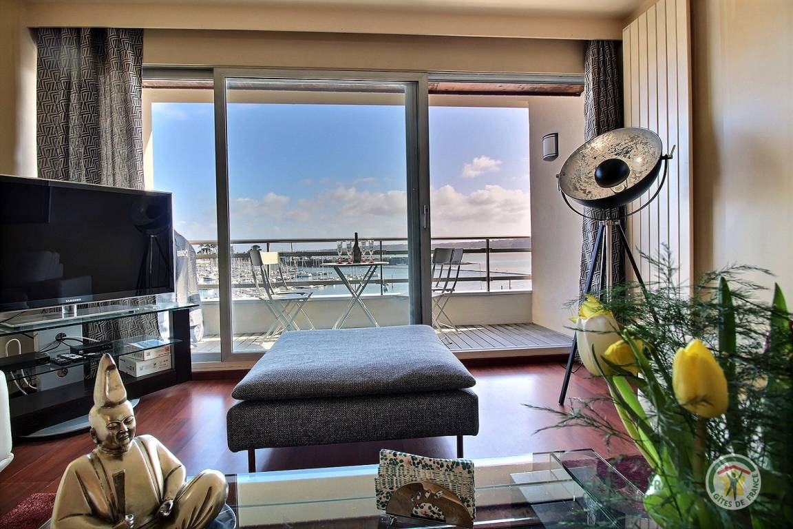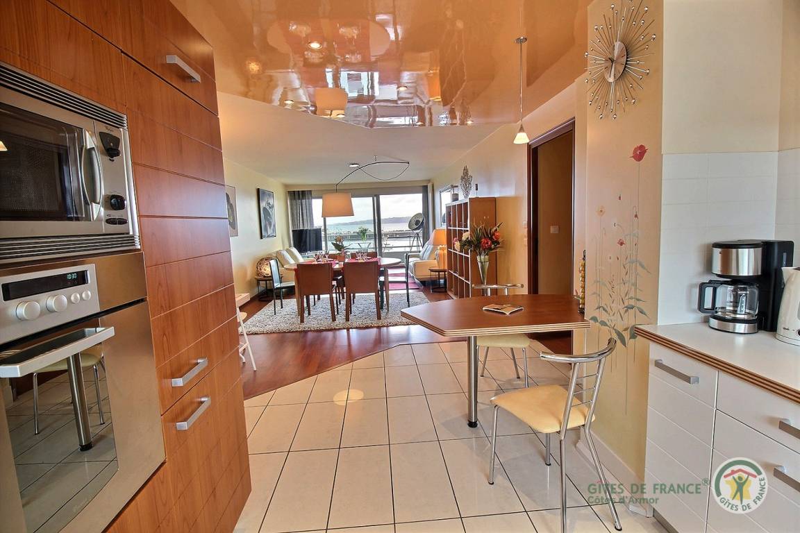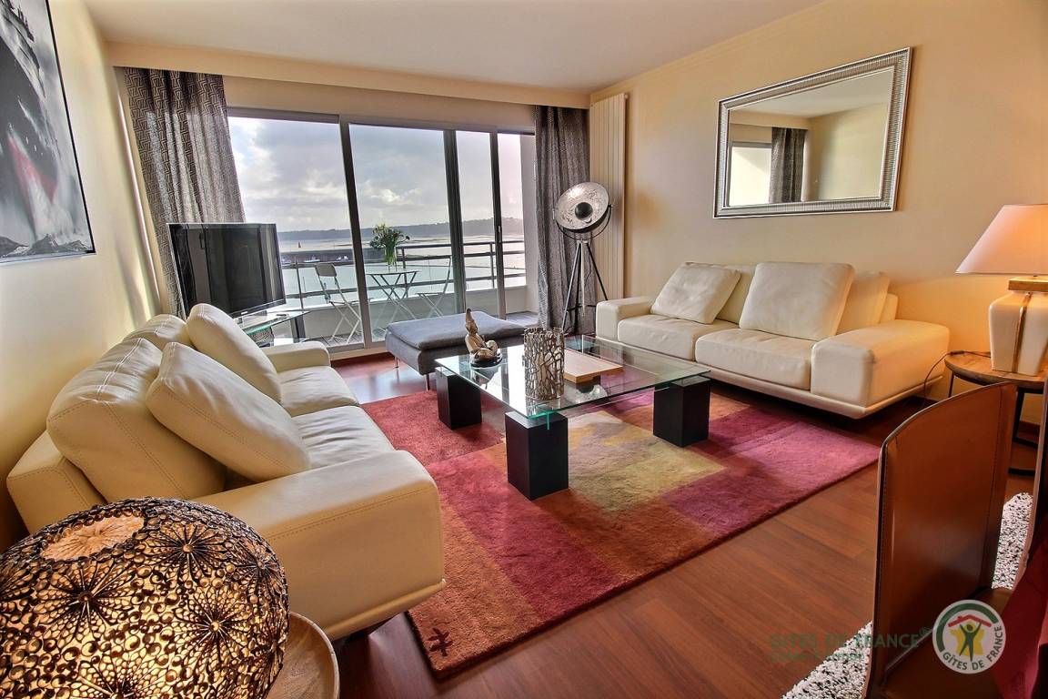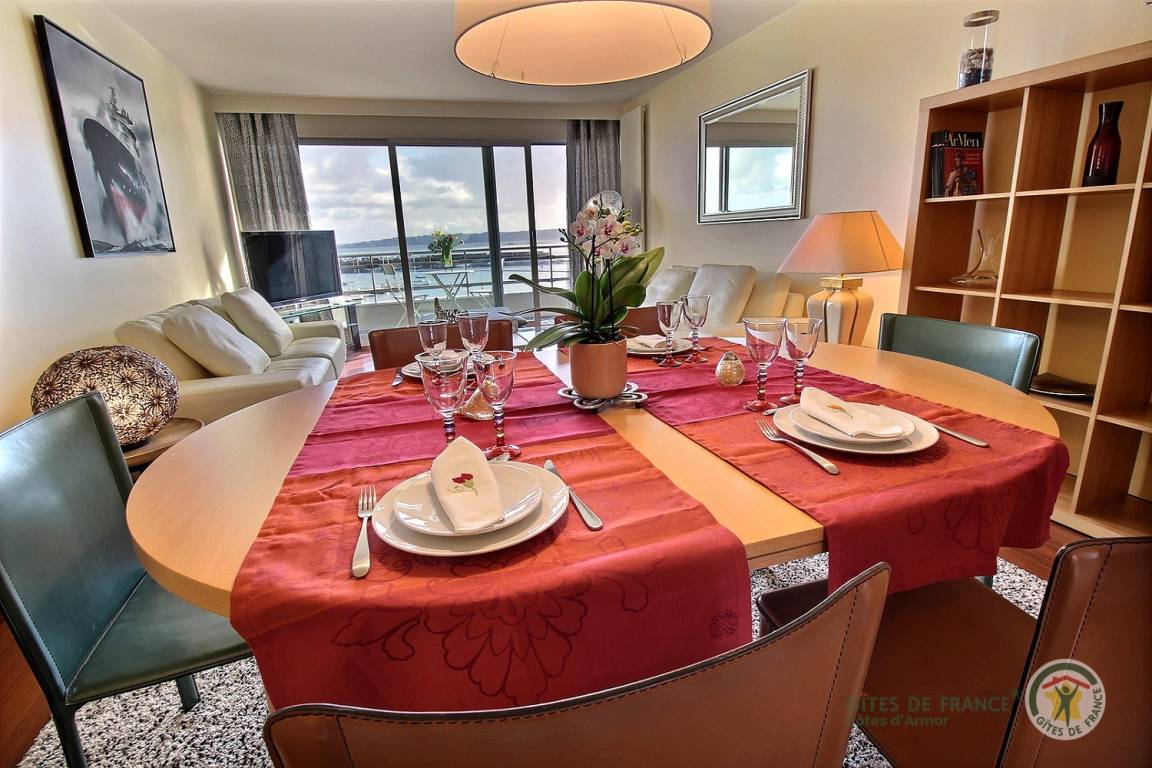 Großer Wohnraum mit Küche, Wohnzimmer, Wohnzimmer mit Blick auf den Hafen, Zugang über einen großen Flur: Badezimmer mit Dusche, separates WC mit Waschbecken, 2 Schlafzimmer: Das 1. Schlafzimmer verfügt über 1 180 x 200 cm großes Bett und verfügt über eine kleine Terrasse (Zugang). (durch das große Erkerfenster) mit Liegestühlen ausgestattet, so dass Sie den Blick auf den Yachthafen von Perros-Guirec genießen können, und das 2. Schlafzimmer mit eigenem Bad (Dusche und Waschbecken) besteht aus 2 Einzelbetten im Format 90 x 200.