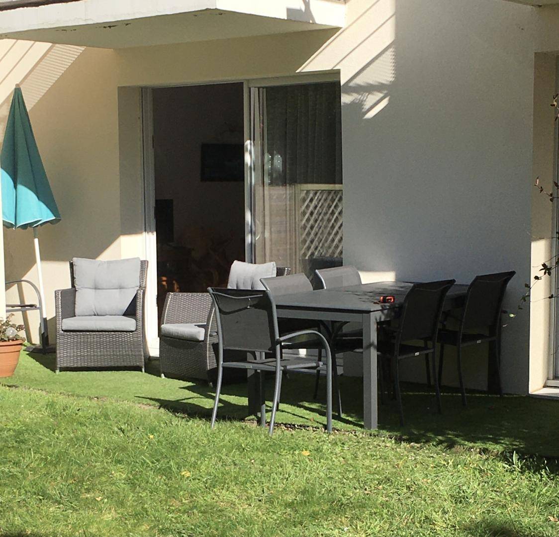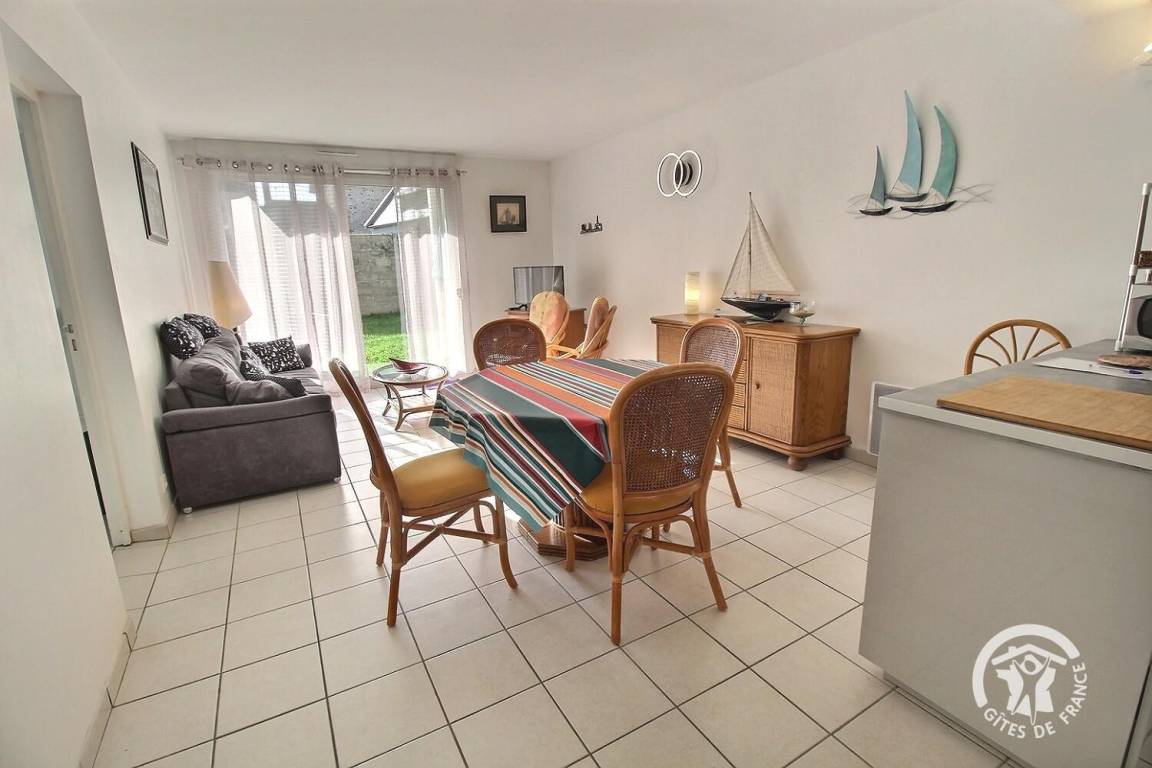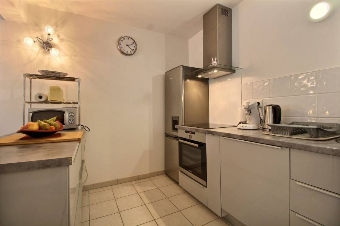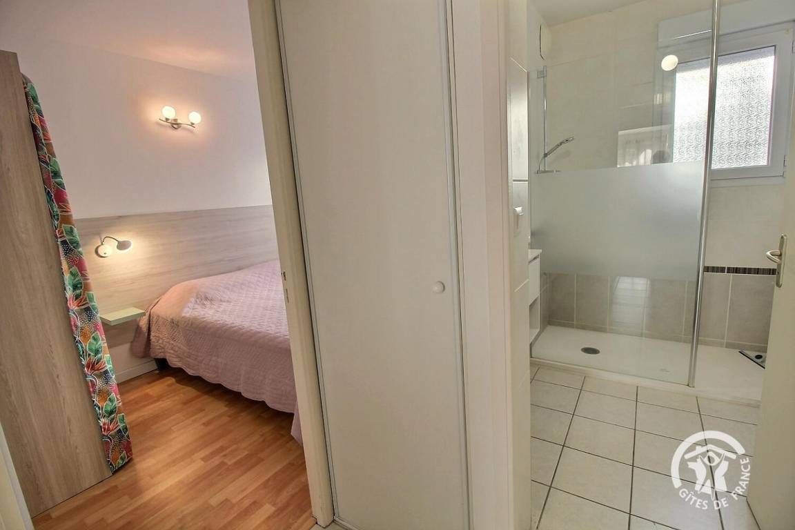 Diese Urlaubswohnung im Erdgeschoss eines Wohnsitzes (keine Treppe) umfasst: ein Ess-Wohnzimmer mit offener, ausgestatteter Küche, 1 Schlafzimmer (Bett 160x200) mit eigenem Bad mit WC. 2 weitere Zimmer (Bett 140x190) (2 Betten 90x190), ein Badezimmer, eine separate Toilette und eine Waschküchenecke. Kleine Terrasse mit Rasenfläche zur gemeinsamen Verfügung mit dem Wohnsitz. Zwei private, gesicherte Parkplätze im Untergeschoss.