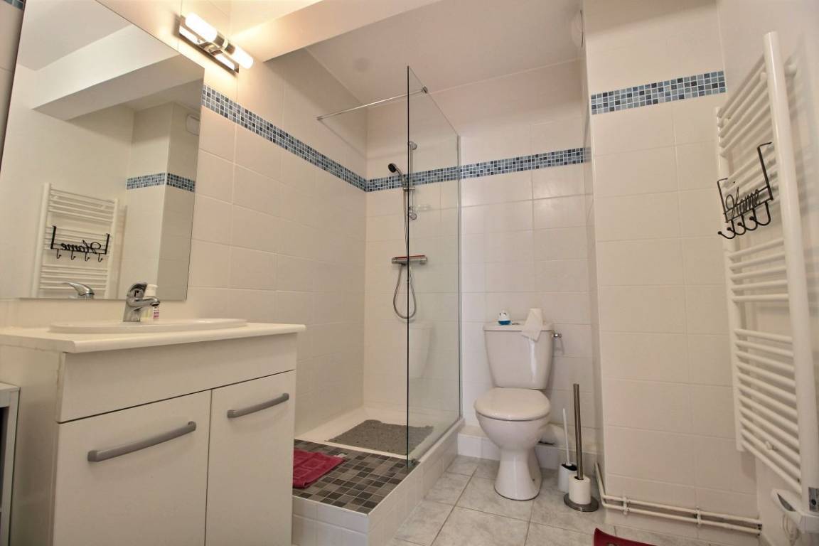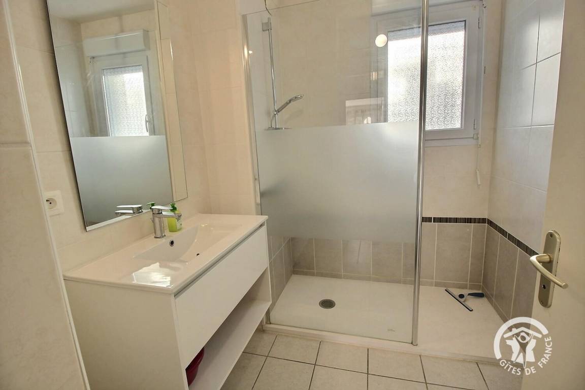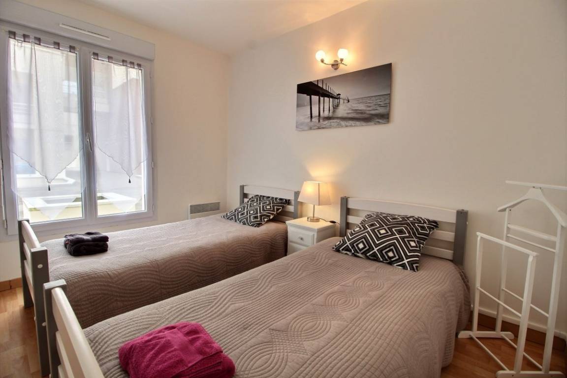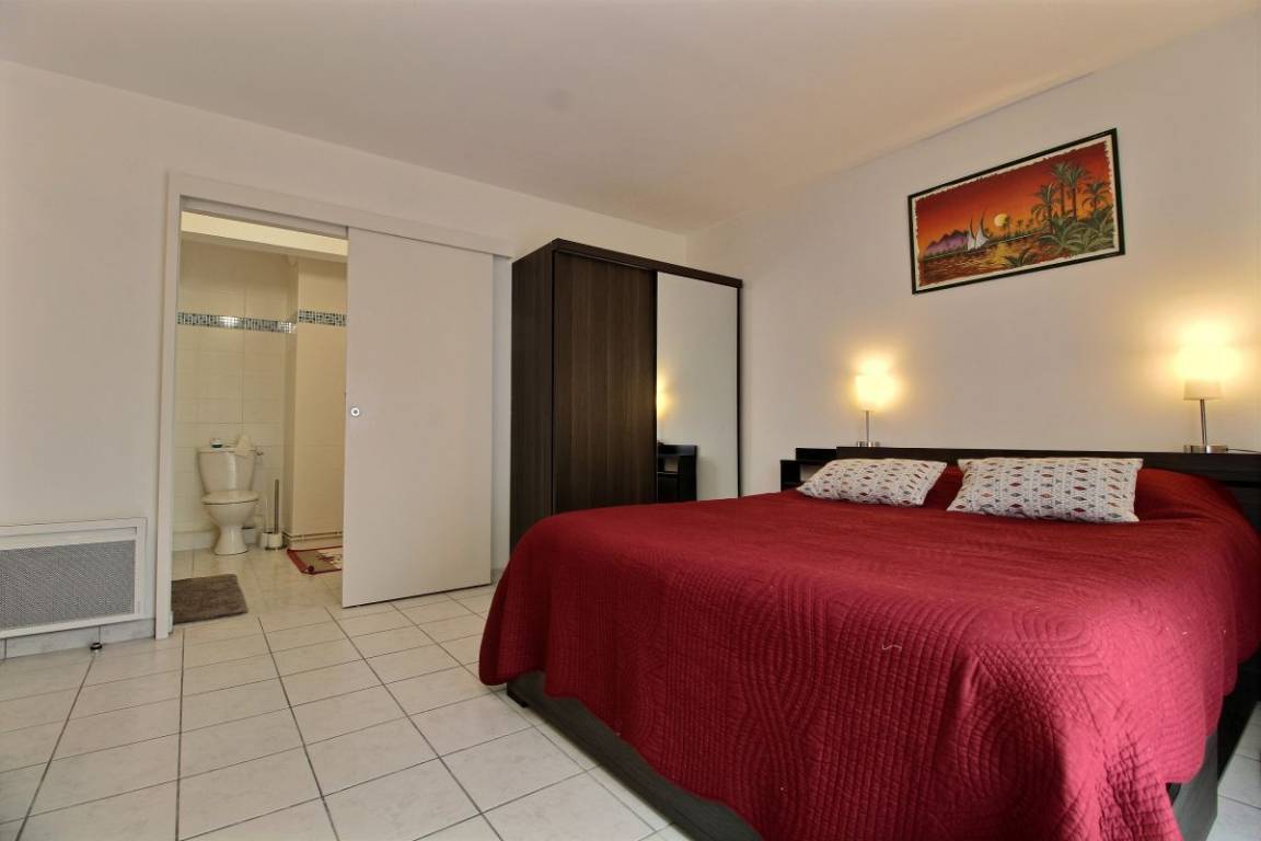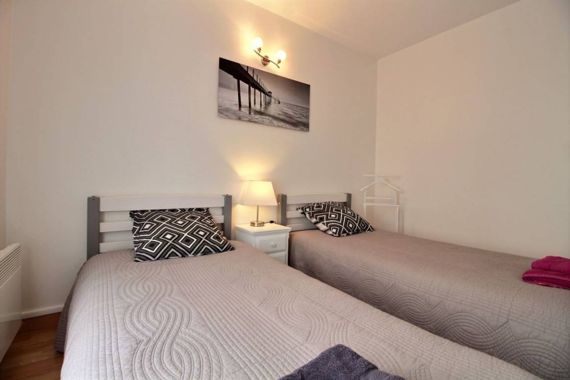 Diese Urlaubswohnung im Erdgeschoss eines Wohnsitzes (keine Treppe) umfasst: ein Ess-Wohnzimmer mit offener, ausgestatteter Küche, 1 Schlafzimmer (Bett 160x200) mit eigenem Bad mit WC. 2 weitere Zimmer (Bett 140x190) (2 Betten 90x190), ein Badezimmer, eine separate Toilette und eine Waschküchenecke. Kleine Terrasse mit Rasenfläche zur gemeinsamen Verfügung mit dem Wohnsitz. Zwei private, gesicherte Parkplätze im Untergeschoss.