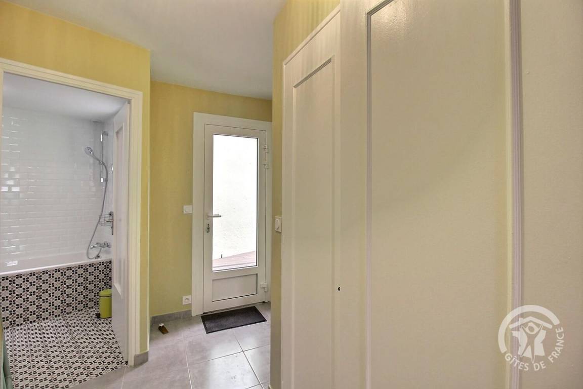 Eingangshalle mit Schrank, großes Wohnzimmer mit Zugang zu einer kleinen Terrasse, gut ausgestattete Einbauküche, 3 Schlafzimmer mit Zugang zur Terrasse (1 160x200-Bett) (2 80x200-Betten) und (1 160x200-Bett), Badezimmer (Badewanne, Waschmaschine usw.). Trockner), separates WC.