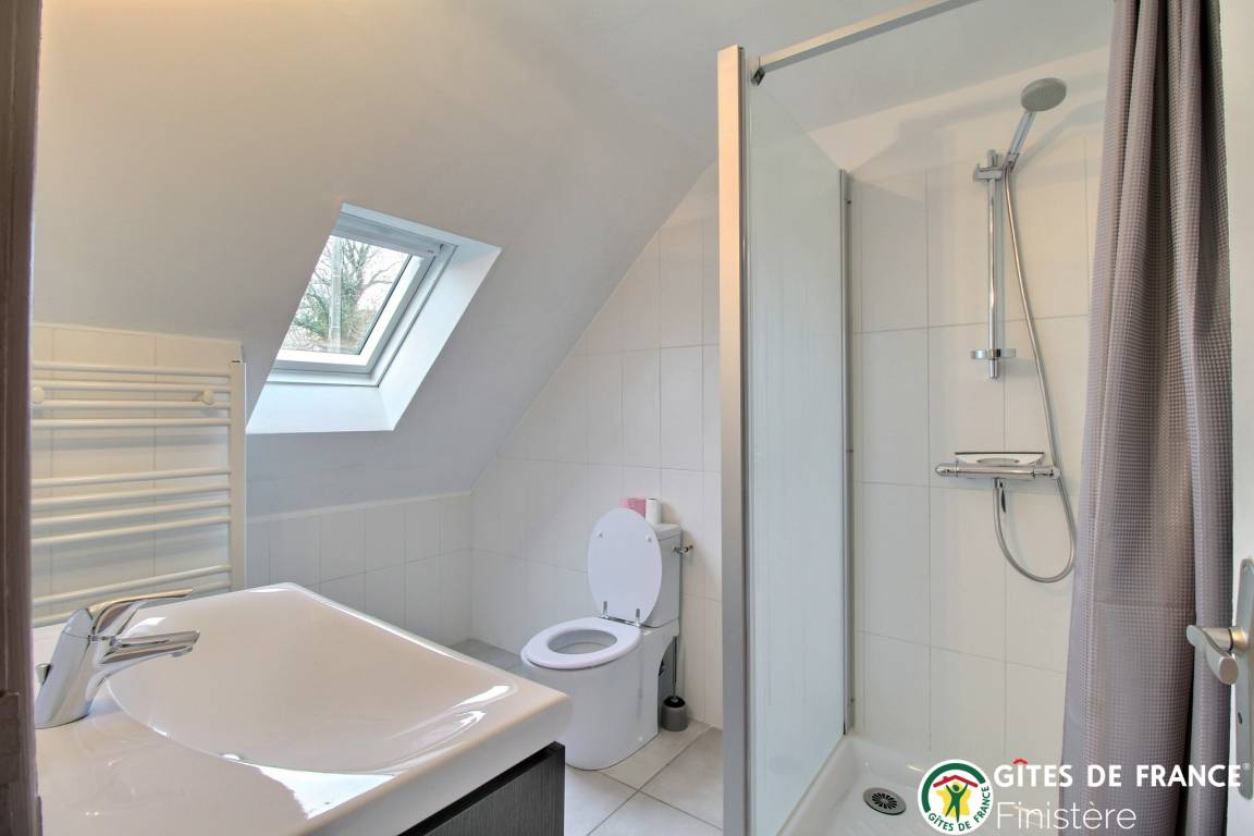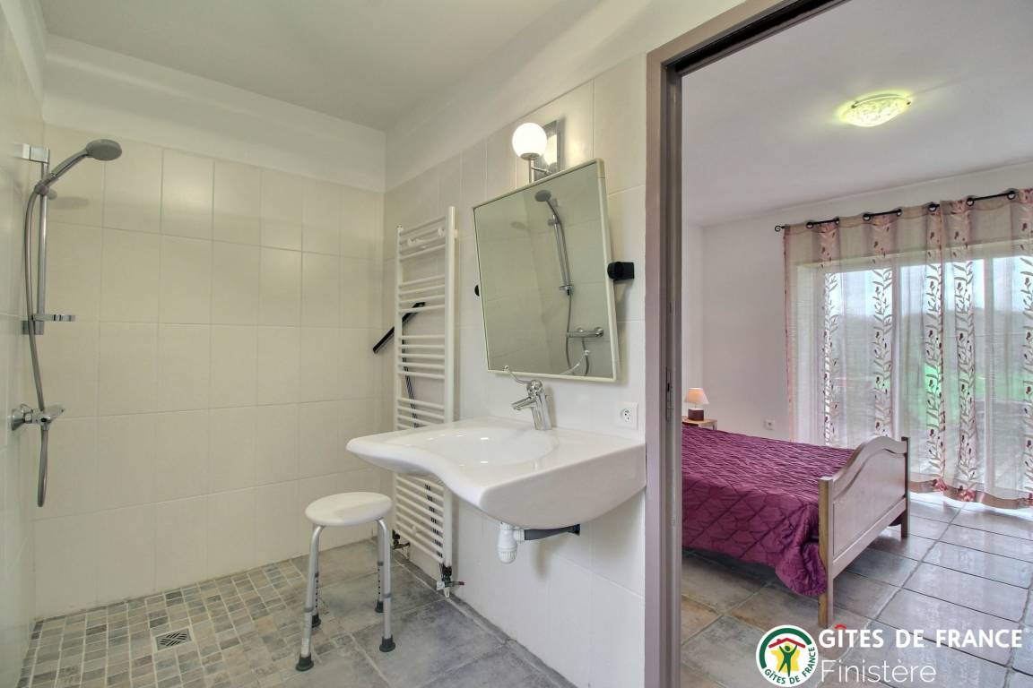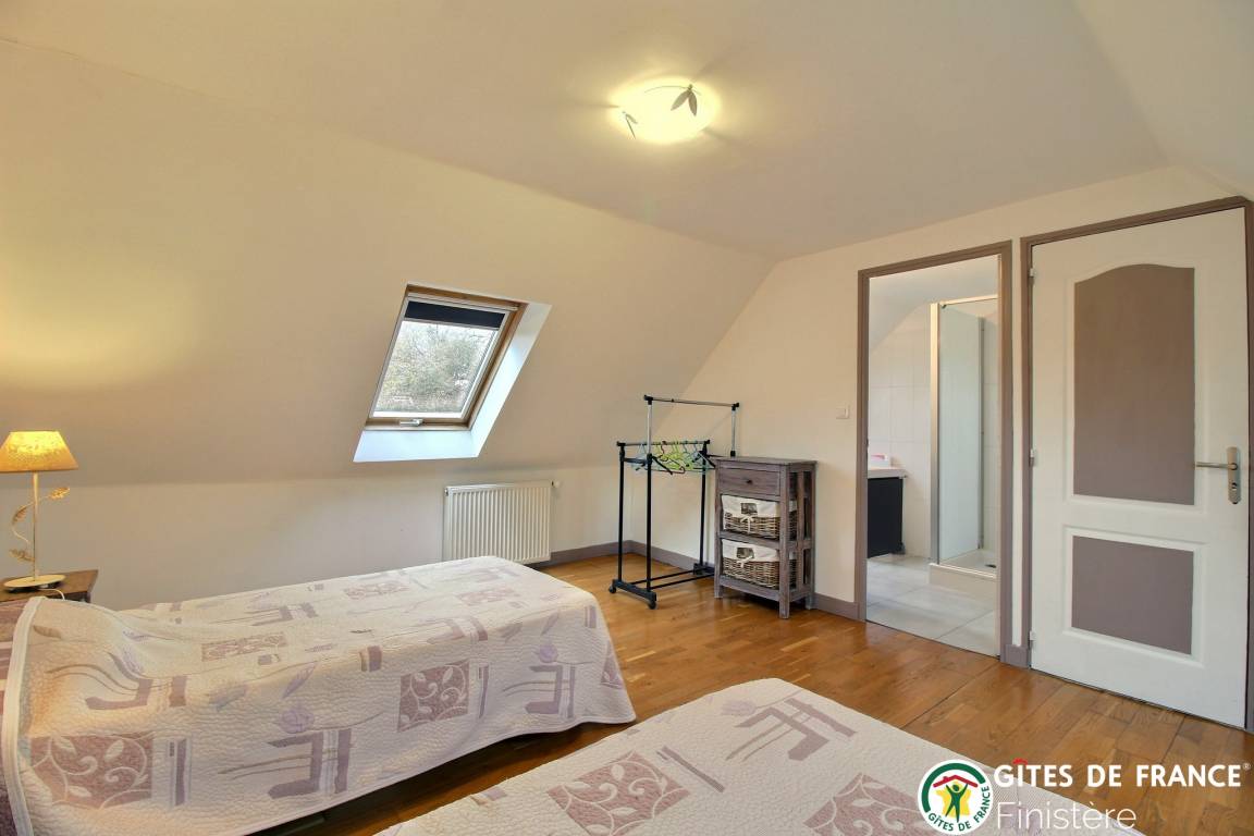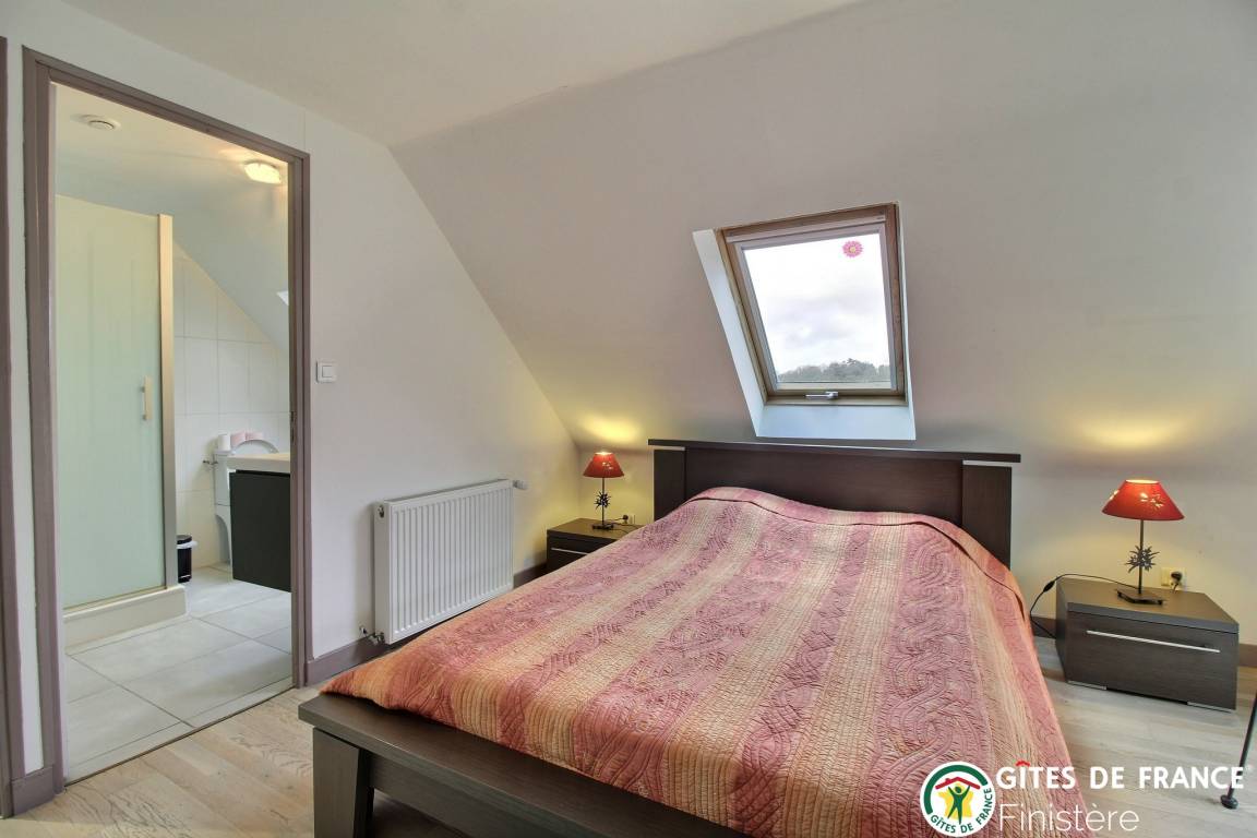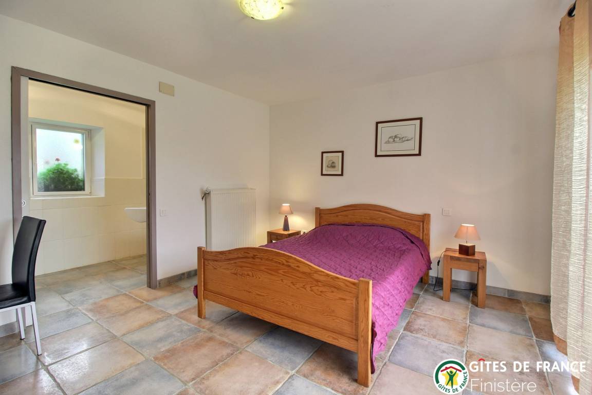 Dieses geschmackvoll renovierte Haus grenzt an einen weiteren Gîte und befindet sich auf dem Lande bei Peumerit nur 5 Autominuten vom Meer entfernt. EG: Küche mit Zugang zum Wohn-/Esszimmer (39m²) mit Holzofen, gehbehindertenzugängliches Doppelzimmer mit eigener Dusche/WC, sep. WC. 1.Stock: Doppelzimmer, Zweibettzimmer (beide Schlafzimmer mit eigener Dusche/WC. Luftwärmeheizung. WiFi. Umzäunter Garten, Gartenmöbel, Grill. Terrasse.