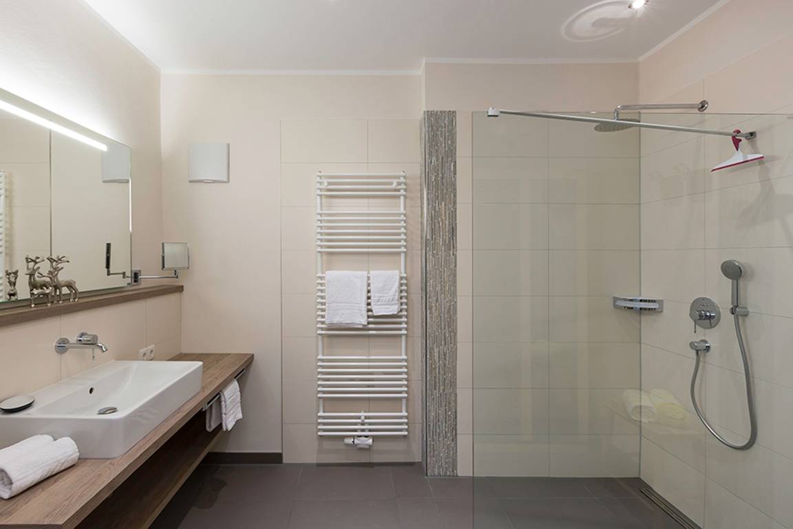 Bad mit begehbarer Dusche, Handtuchheizung, Föhn und Waschbecken