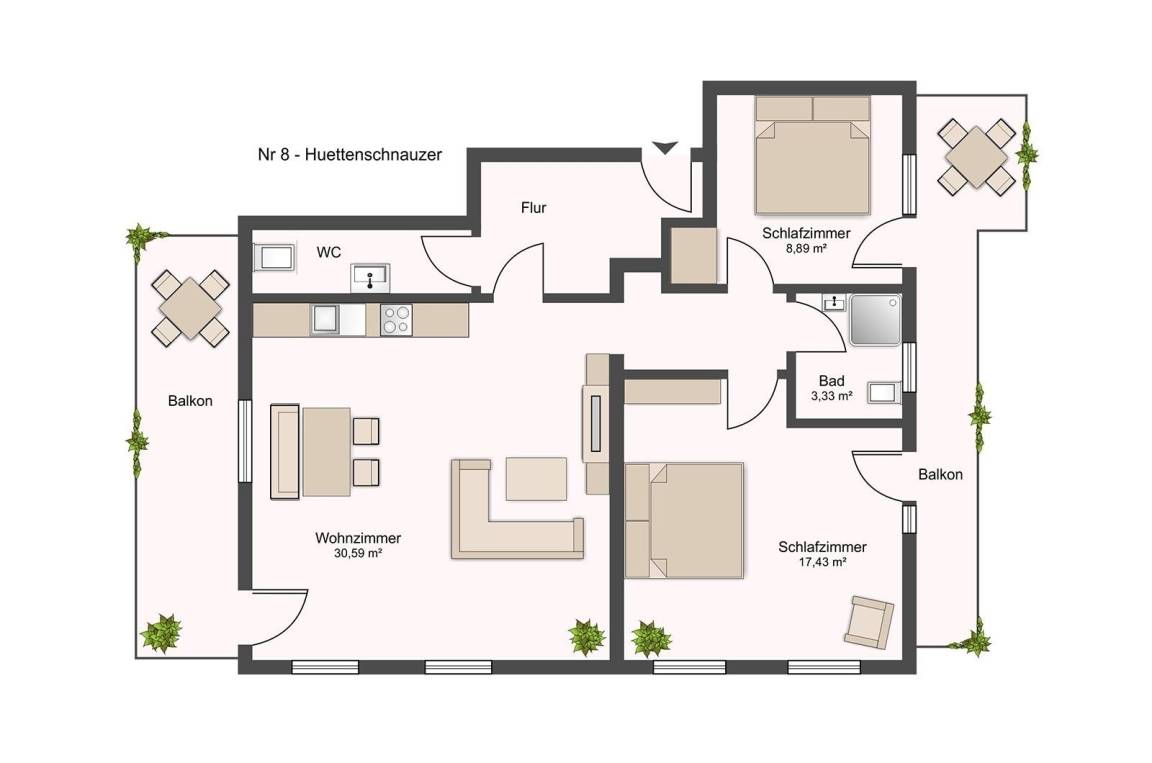 Die Wohnung Hüttenschnauzer bietet reichlich Platz für Ihre Familie. Mit zwei Schlafzimmern, einem separaten WC, dem großen Balkon, der über beide Schlafzimmer zu erreichen ist, sowie einem weiteren Balkon zur Südseite fühlen Sie sich direkt wohl!
