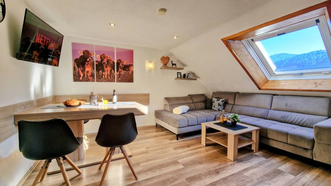 Familien-Ferienwohnung mit zwei Schlafzimmer, jeder mit einen Smart Tv., Babybett, ein Wohnraum mit Küche, Essbereich und Smart Flachbild-TV., Sofa, ein Bad, separates WC, und große Ost-Balkon mit Bergblick.