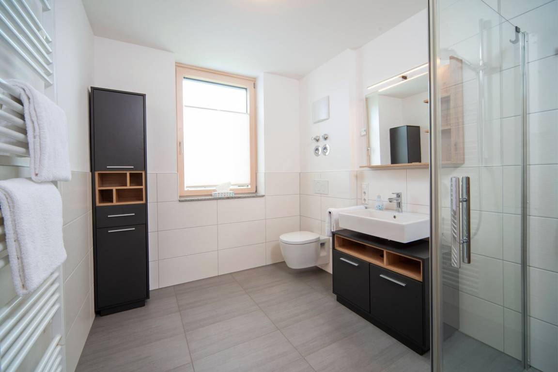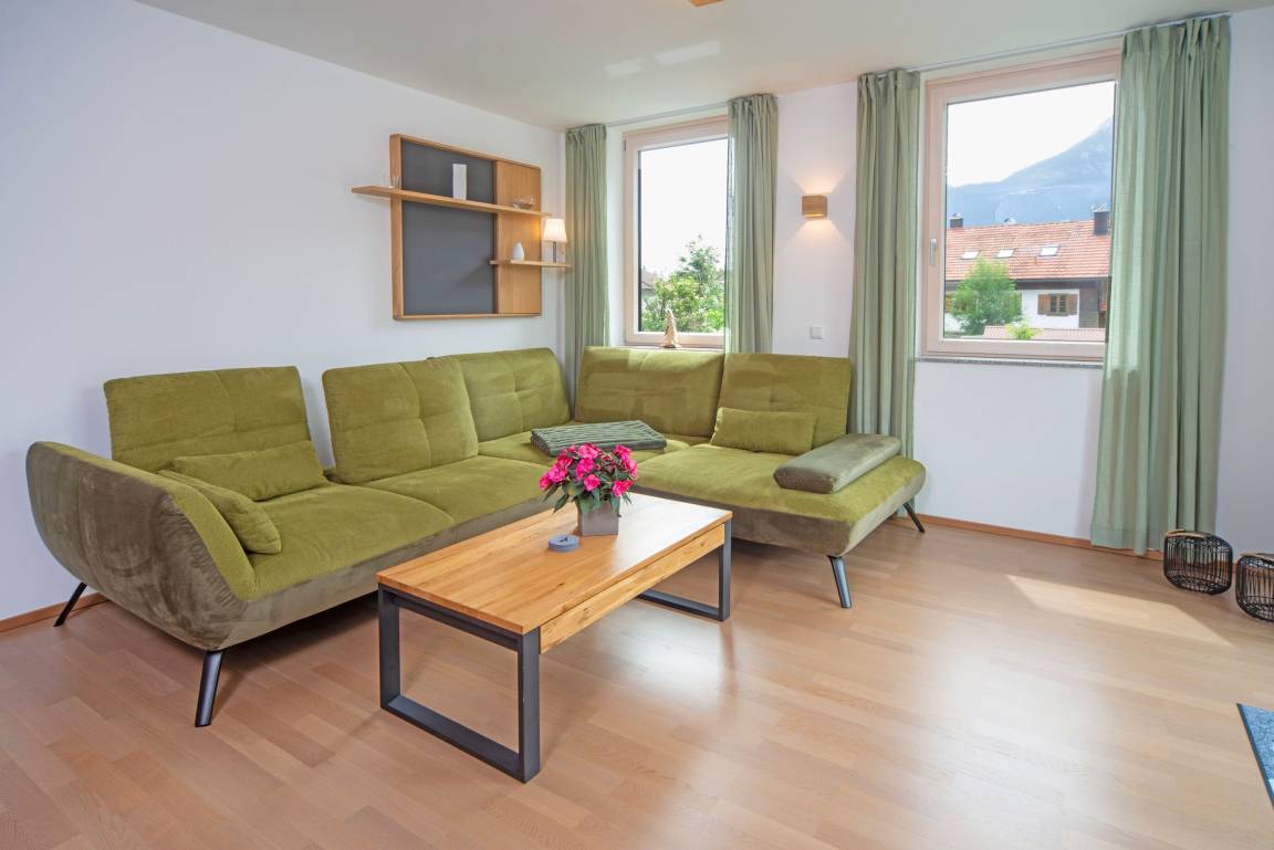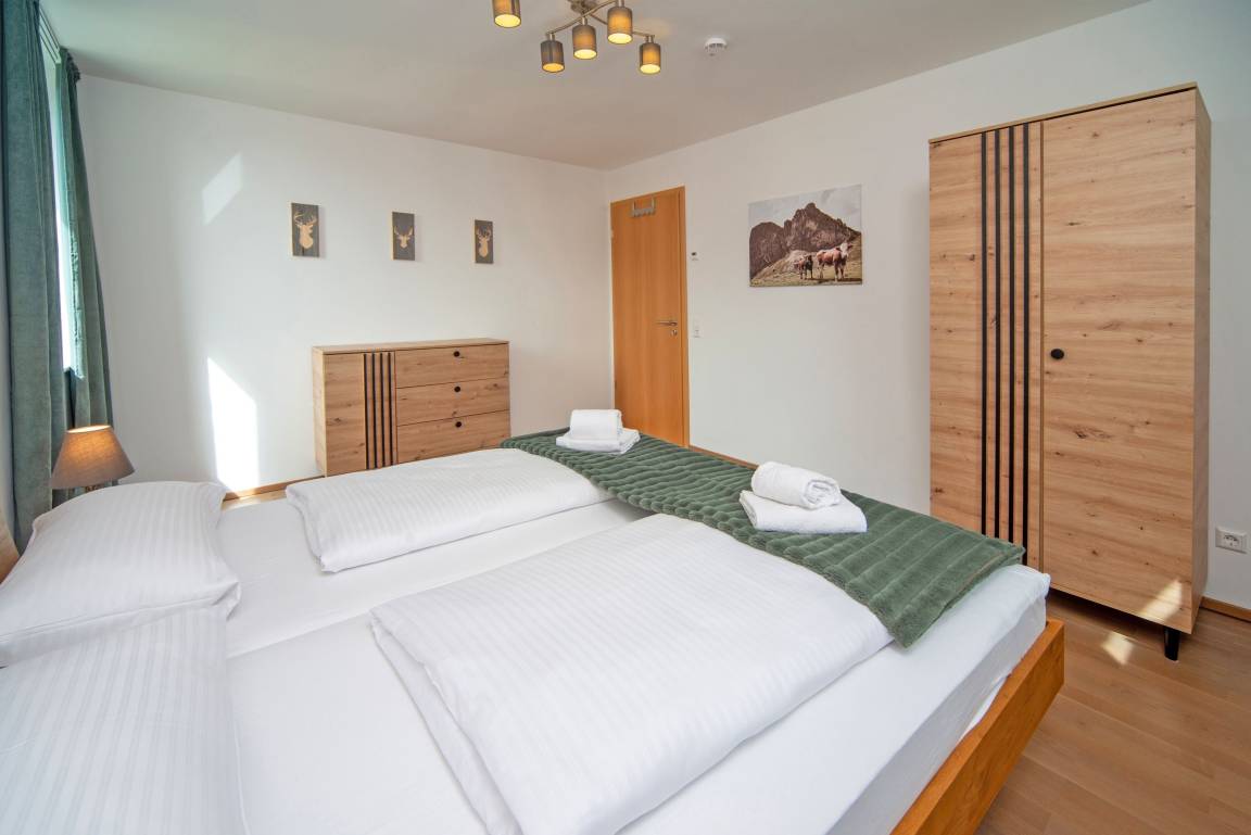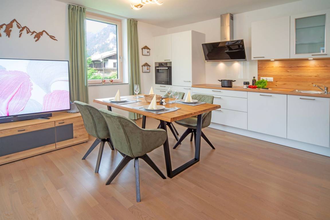 Freuen Sie sich auf zwei großzügige Doppelschlafzimmer mit hochwertigen Matratzen (180x200 cm) und guter Ausstattung. Verdunkelungsvorhänge und Fliegengitter sorgen für ruhige Nächte. Stauraum bieten Kleiderschränke und Kommoden. Kochen [&] Genießen in der offenen Wohnküche. Die moderne Küche ist voll ausgestattet mit Spülmaschine, Ceran-Kochfeld, Backofen, Kühlschrank, zusätzlichem Gefrierschrank sowie reichlich Geschirr und Küchenutensilien – ideal für gemeinsame Kochabende. Der lichtdurchflutete Wohnbereich im modernen alpinen Stil mit Echtholz-Parkett lädt zum Verweilen ein. Eine große, gemütliche Couchlandschaft, ein 65-Zoll-Smart-TV und eine hochwertige Soundbar mit Bluetooth-Streaming sorgen für Unterhaltung. Der Essbereich mit Echtholz-Tisch bietet Platz für vier Personen. Ein modernes Tageslichtbad für Ihre Wellness-Momente mit ebenerdiger Echtglas-Dusche, Fußbodenheizung, ein elektrischer Handtuchwärmer sowie stilvolle Sanitärausstattung schaffen ein angenehmes Ambiente.