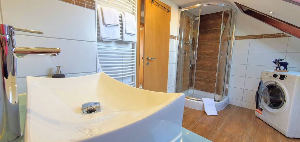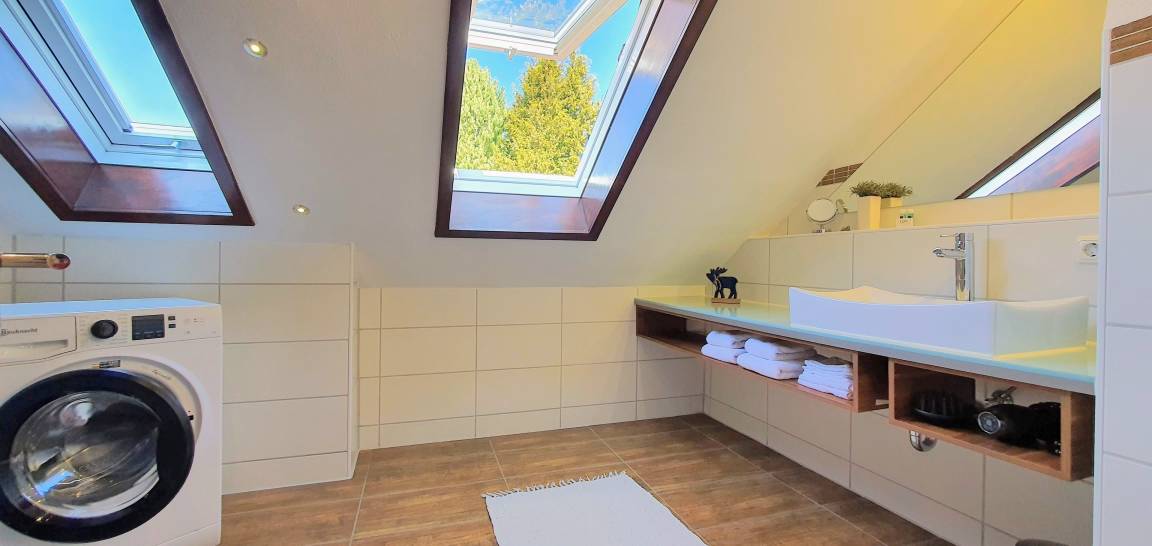 Ein geräumiges und wegen der 2 Dachfenster helles Bad , Runddusche und Duschmaster, separates WC.