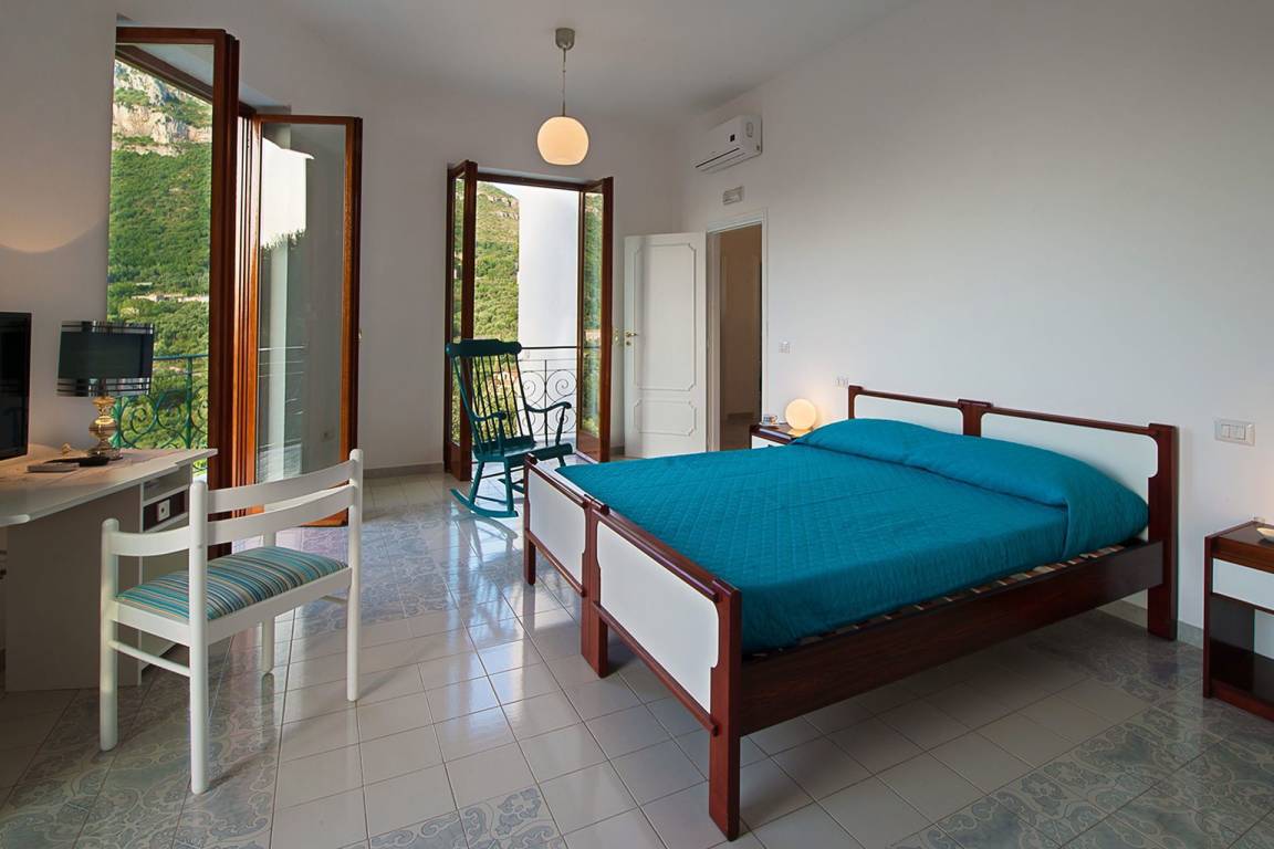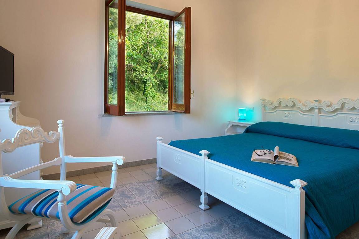 Das Erdgeschoss verfügt über eine vollausgestattete Küche mit Geschirrspülmaschine, Kühlschrank, Gefrierschrank, Kochfeld, Ofen und italienischer Kaffeemaschine sowie Wi-Fi-Verbindung. Das Wohnzimmer auf dieser Ebene ist mit Sofa, Sessel und Esstisch ausgestattet, verfügt über Wi-Fi-Zugang und hat einen direkten Ausgang zum Garten. Das Erdgeschoss beherbergt 2 Schlafzimmer, jeweils mit Doppelbett, Wi-Fi und Klimaanlage, beide mit privatem Ausgang zur Terrasse. Die 2 Bäder auf dieser Ebene sind mit Waschbecken, Toilette, Bidet, Dusche und Haartrockner ausgestattet; das zweite Bad verfügt zusätzlich über eine Badewanne. Beide Bäder haben Wi-Fi-Zugang.