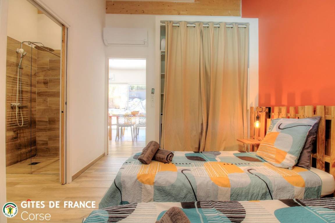 - 1 Schlafzimmer mit 2 Betten (90 x 200 cm), die zusammengestellt werden können , und angrenzendem Badezimmer/WC