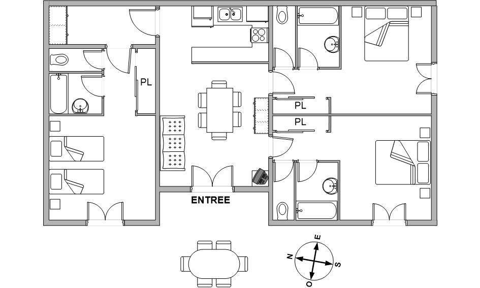 Erdgeschoss: Wohnzimmer mit Kochnische, drei große Schlafzimmer Charakter zwei Doppelbetten (140cm) + 2 Einzelbetten (90cm), jedes mit eigenem Bad und separate wc und tv ausgestattet. Zwei weitere Menschen mit Zuschlag im Verhältnis (Clic - Clac 140) akzeptiert. Öl-Zentralheizung. Zugang Rollstuhl Teile.
