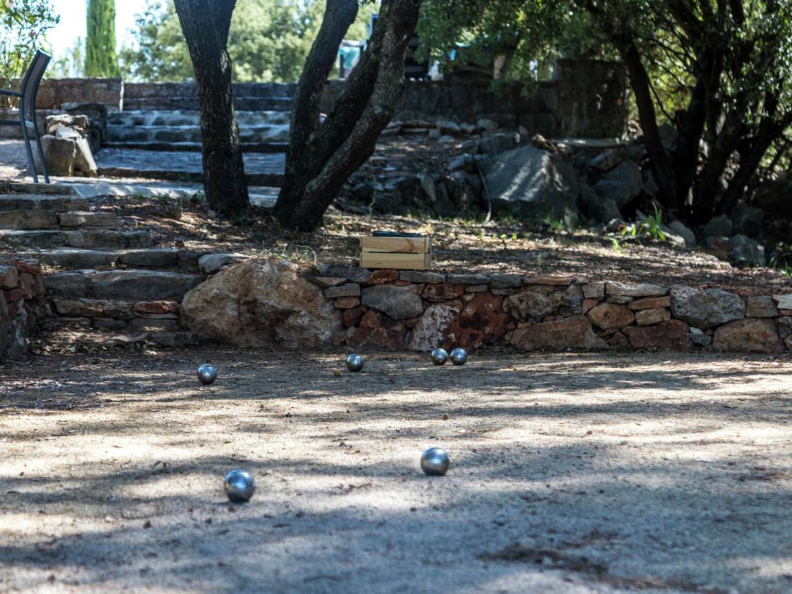 Terrasse(überdacht, 40 m²), Terrasse, Garten(alleinige Nutzung, angelegt, nicht umzäunt, 3,5 hm2), 6x Liegen, BBQ(Gas), 4x Parkplatz(auf dem Gelände), Trampolin, Parasol, Parasol, Pool(im Garten, Wasseralarm, 17 x 7 m., Tiefe: 1.4 - 2.2m, geöffnet von Jun bis einschließlich Sep), Boulebahn, 1x Kinderbett (ohne Bettwäsche), 1x Hochstuhl