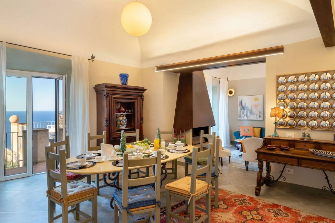 Wohnzimmer: zwei Sofas, Esstisch (Personen: 10), WiFi Internet, Klimaanlage, Satelliten-TV, Ausgang auf die Terrasse.