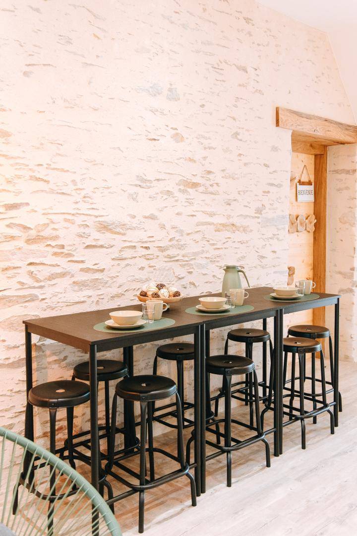 Im Hauptwohnzimmer mit seiner restaurierten Steinmauer finden Sie eine Reihe von hohen Tischen zum Essen,