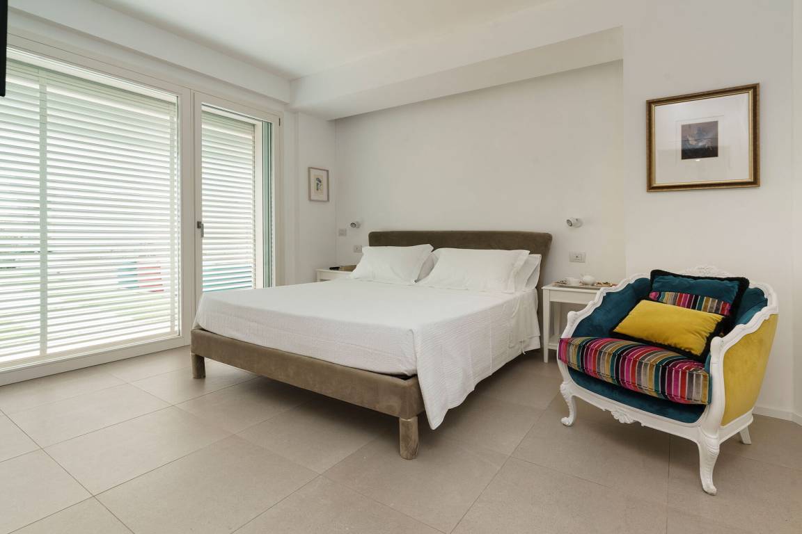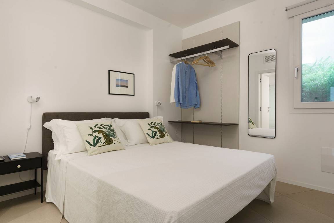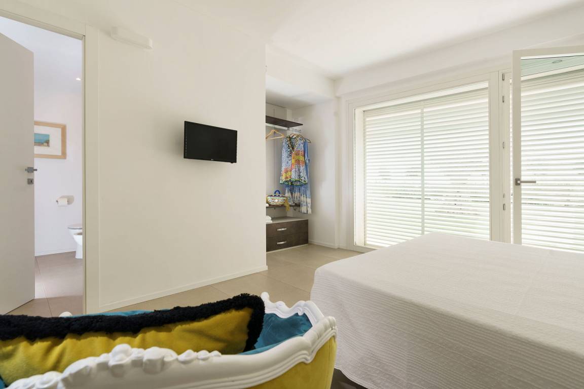 Schlafzimmer mit Bad 1: Doppelbett, Krippe, WiFi Internet, Internet, Klimaanlage, Fliegengitter, Satelliten-TV, Sessel, Waschbecken, WC, Bidet, Dusche, Fön, Badezimmer ohne Fenster, Ausgang auf die Terrasse.