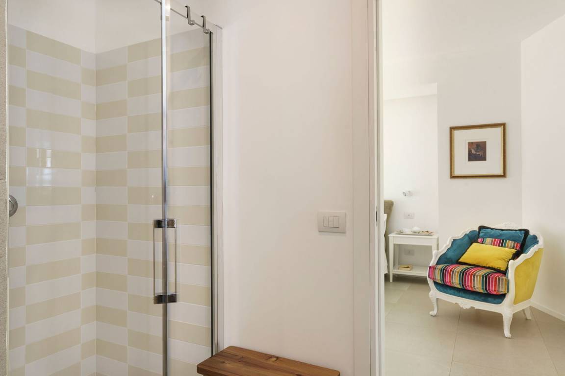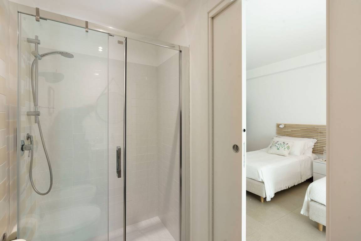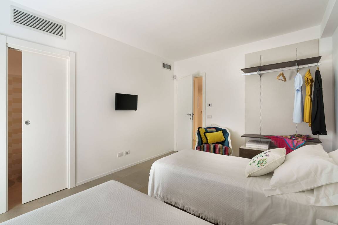 Schlafzimmer mit Bad 4: zwei Einzelbetten, WiFi Internet, Internet, Klimaanlage, Fliegengitter, Satelliten-TV, Sessel, Waschbecken, WC, Bidet, Dusche, Fön, Ausgang auf die Terrasse.