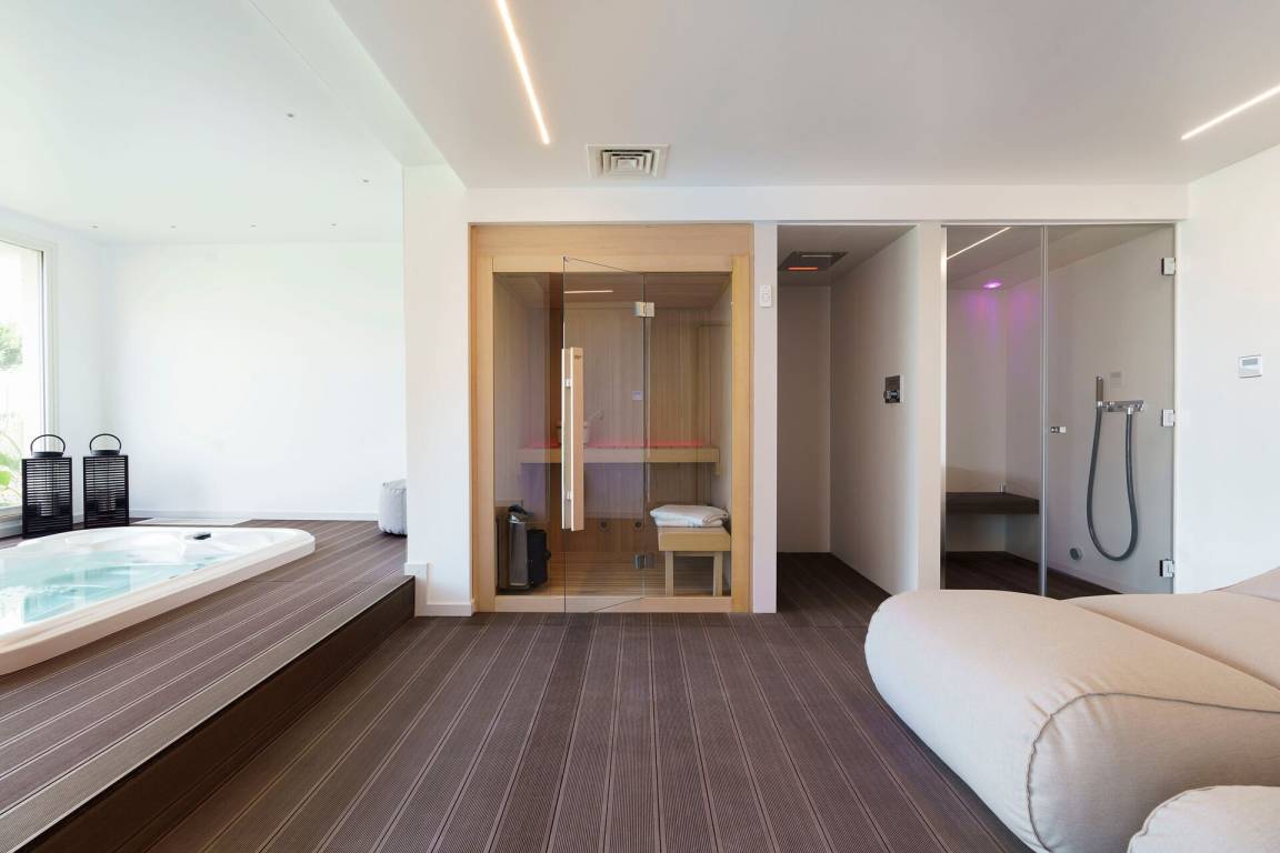Wellnessbereich: Heißwasser-Whirlpool im Haus, Dusche, Sauna, zwei Sonnenliegen, WiFi Internet, Internet, Dampfbad.