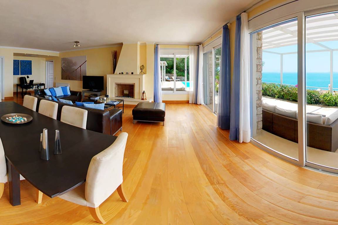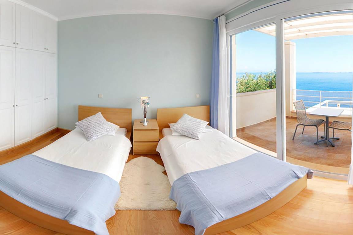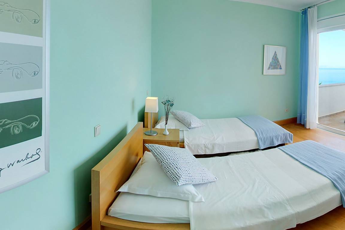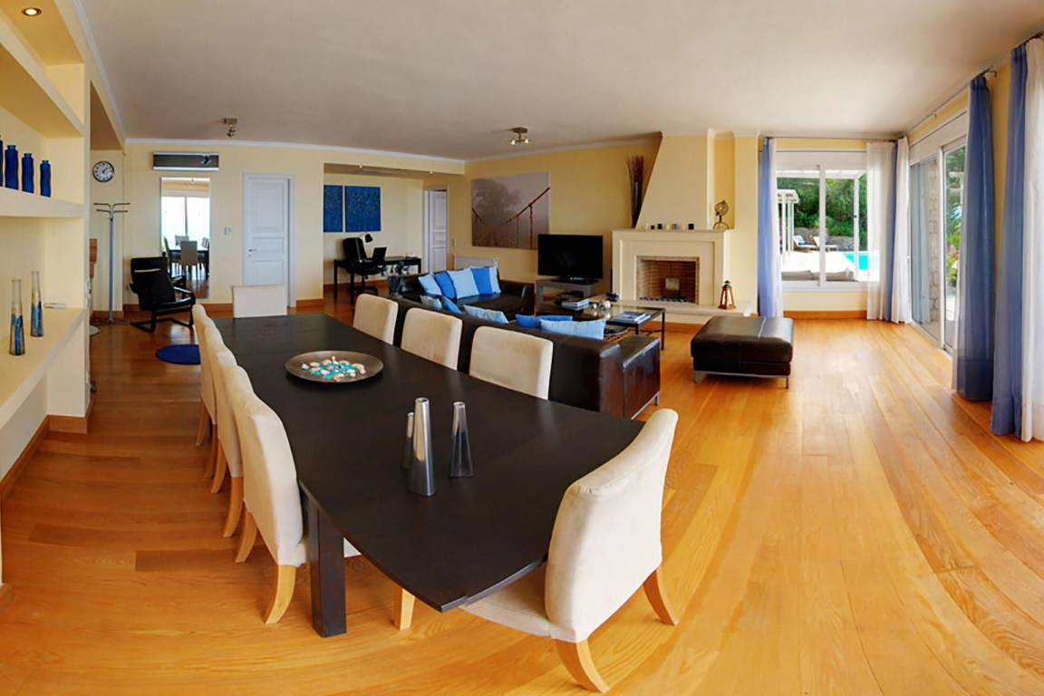 Die Villa umfasst 4 Schlafzimmer und 4 Bäder und bietet Platz für bis zu 8 Gäste. Die Räume sind über mehrere Geschosse verteilt und kombinieren großzügige Schlafbereiche mit Wohn- und Esszonen, die fließend ineinander übergehen.