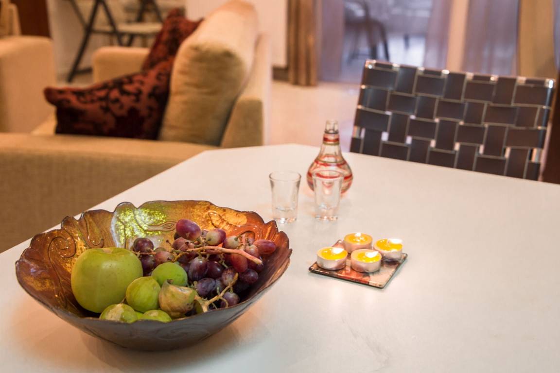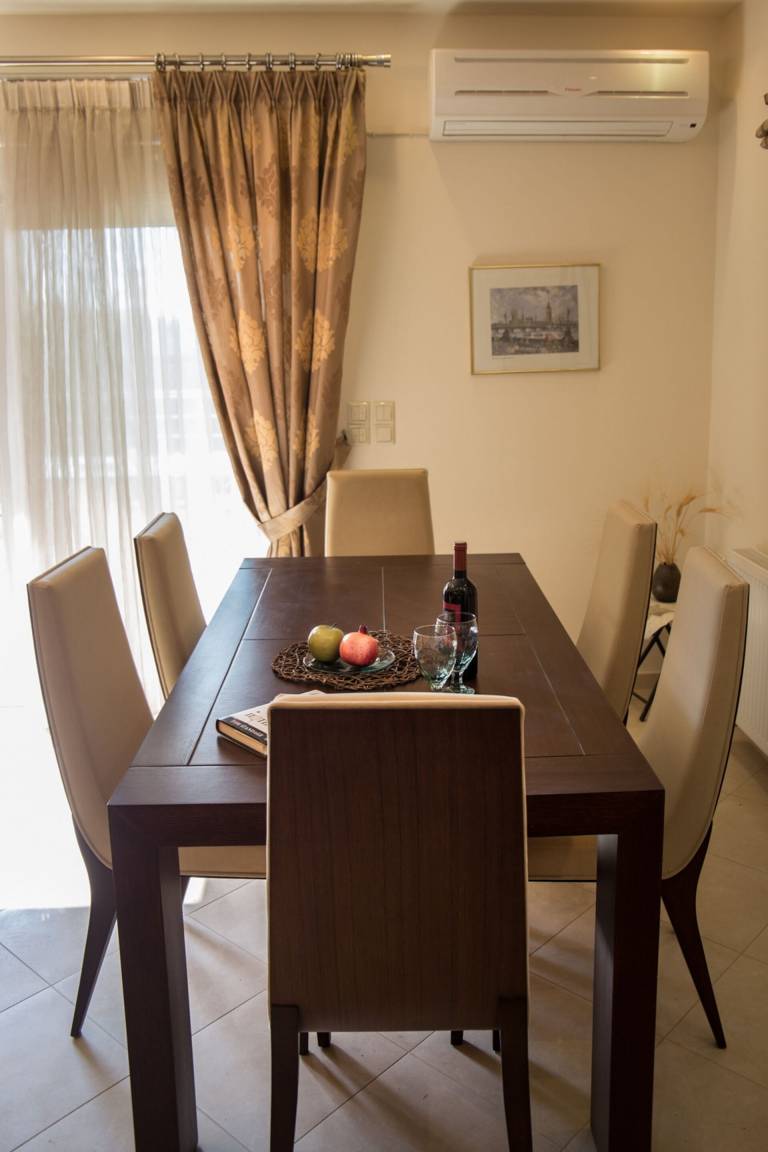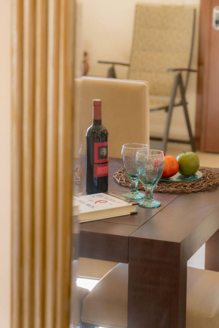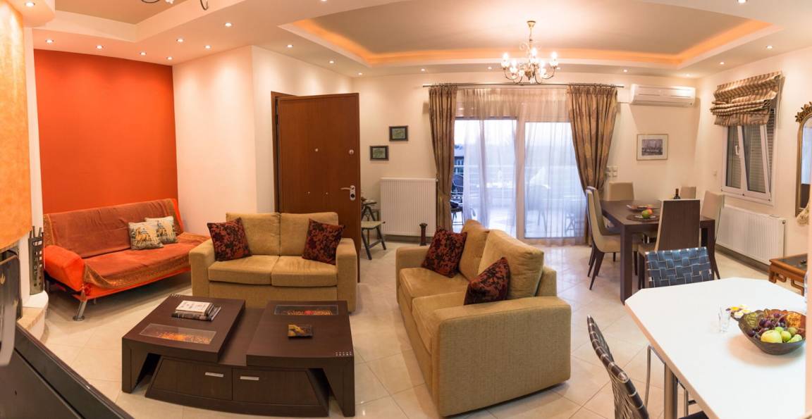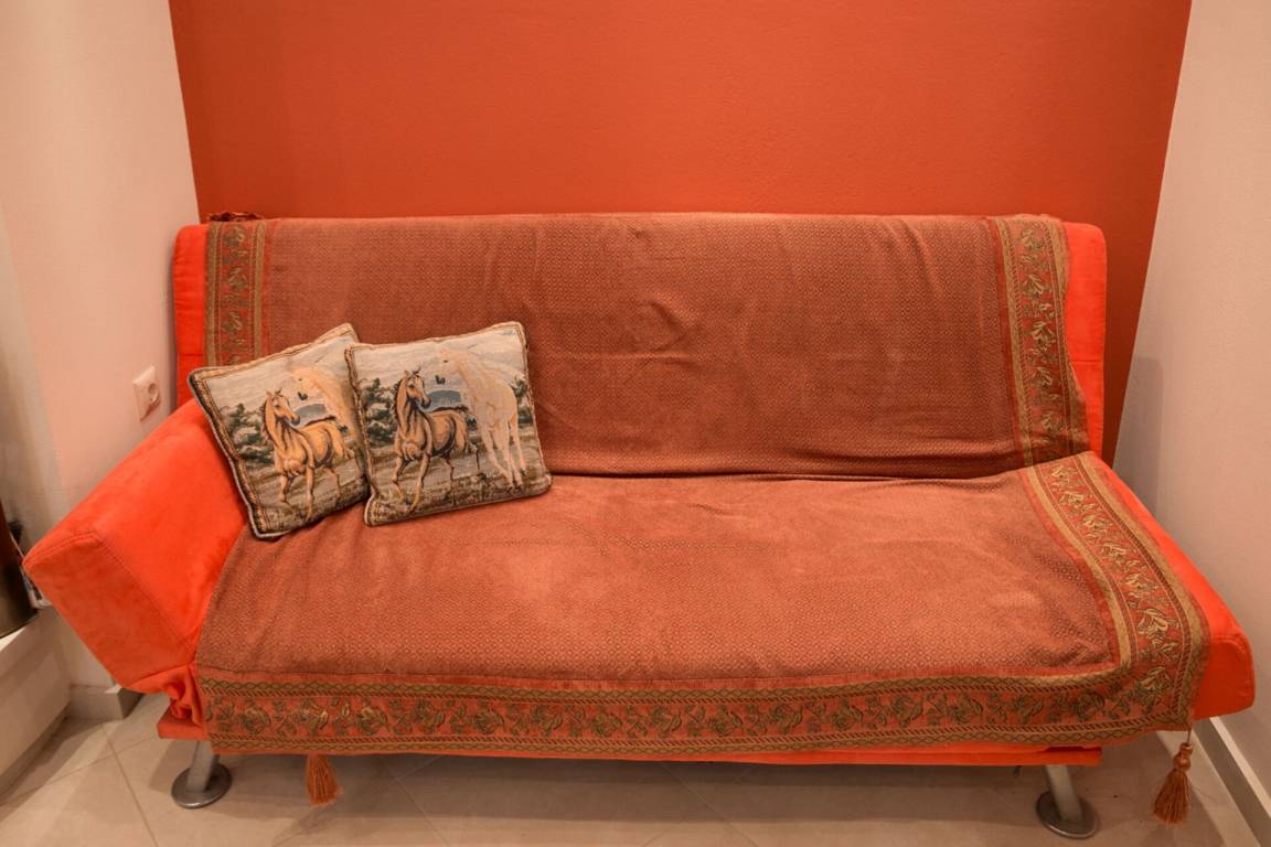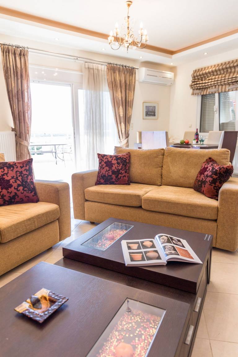 Wohnzimmer: Sofa, zwei Sessel, Kamin, Esstisch (Personen: 6), Sofa bed, WiFi Internet, Internet, Klimaanlage, Satelliten-TV, TV, Rauchmelder, Ausgang auf den Balkon.