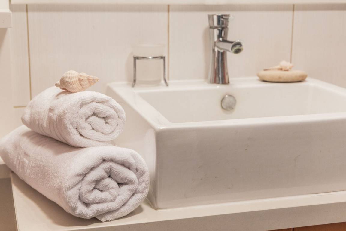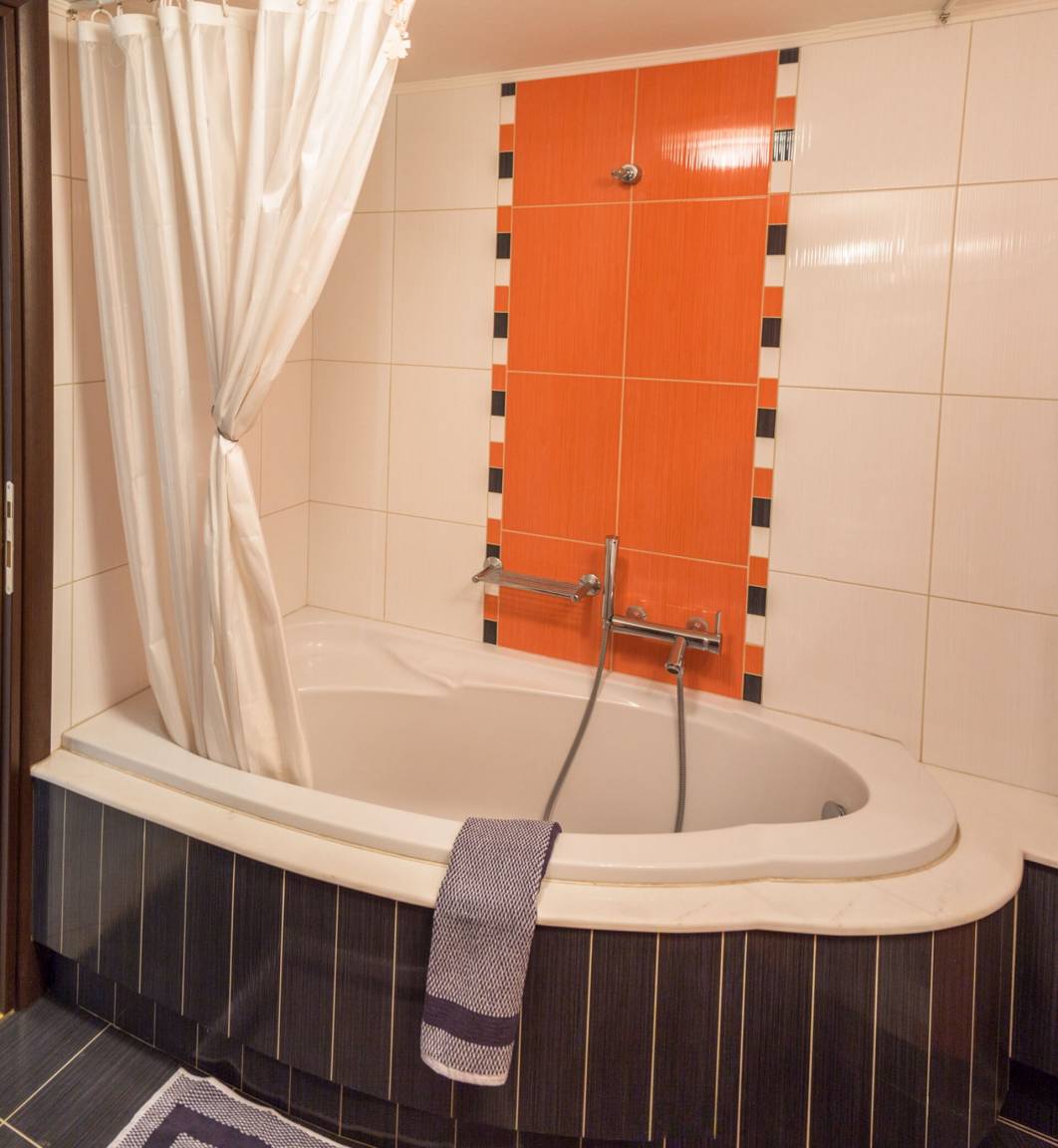 Badezimmer: Waschbecken, WC, Badewanne, Fön, Waschmaschine.