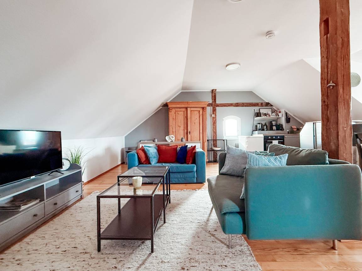 Die Ausstattung des Apartments umfasst ein gemütlichen Wohnzimmer mit offener Küche und einem großen Esstisch für gemütliche Abende, einen Flachbild-TV, sowie einen Internetzugang via WLAN. Die offene Wohnküche ist mit einer Kaffeemaschine (Filter), einem Toaster, einem Wasserkocher und einer Spülmaschine ausgestattet. Für längere Aufenthalte befinden sich auch ein Trockner und eine Waschmaschine in der Ferienunterkunft.