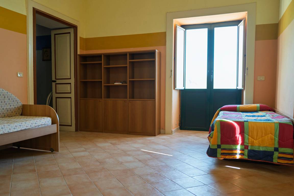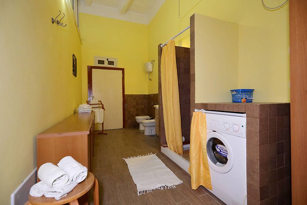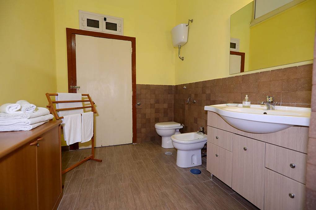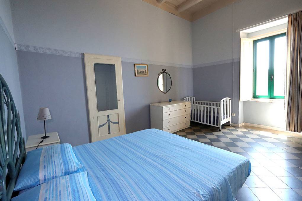 One of the bedrooms is furnished with a double bed and an infant bed. In the second bedroom, which is a pass-through room, the twin beds can be rearranged to form a double bed or converted into a small sofa. This room opens onto the furnished, south-facing balcony, from where you enjoy an unobstructed view of the sea and the Cape of Palinuro. The bathroom (shower/WC/bidet, washing machine) is accessible from the kitchen.