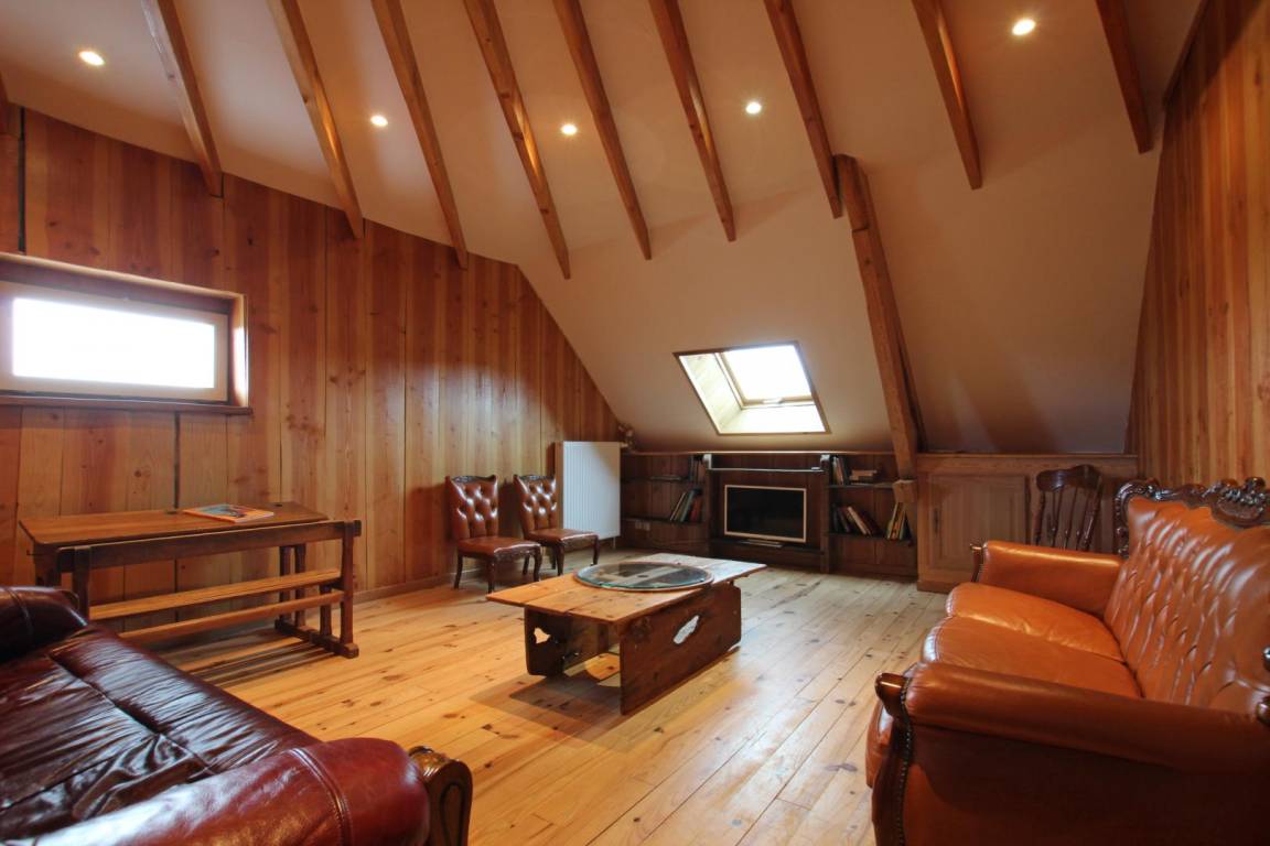 Freistehendes Haus. Erdgeschoss: Wohnzimmer (Kamin, Stereoanlage, Internet auf Anfrage). Offene Küche (Mikrowelle, Geschirrspüler, Elektroherd, Gaskochfeld, Gefrierfach). Schlafzimmer 1 (Doppelbett 140x190 cm). Duschbad mit WC (Waschbecken, ebenerdige Dusche). Spielzimmer (Dartscheibe, Brettspiele, Tischfußball). Obergeschoss: Wohnzimmer (TV). Schlafzimmer 2 (Einzelbett 90x190 cm). Schlafzimmer 3 (zwei Einzelbetten 90x190 cm). Schlafzimmer 4 (Doppelbett 140x190 cm). Schlafzimmer 5 (Doppelbett 140x190 cm). Badezimmer (Waschbecken, beheizter Handtuchhalter, Whirlpool-Badewanne). WC. Waschmaschine. Außenbereich: Privater, nicht umzäunter Garten. Holzterrasse. Gartenmöbel. Sonnenliegen. Grill. Tischtennisplatte auf Anfrage. Überdachter Unterstand. Hofparkplatz. Zentralheizung mit Pelletkessel (gegen Aufpreis). Ein Korb Brennholz für den Kamin ist inklusive, weitere Körbe gegen Aufpreis. Bettwäsche und Handtücher können gemietet werden. Reinigungsservice optional.