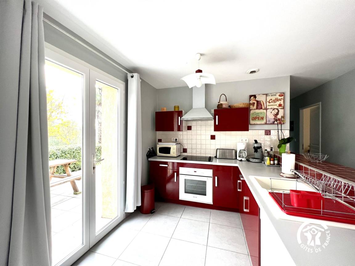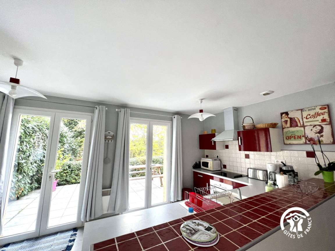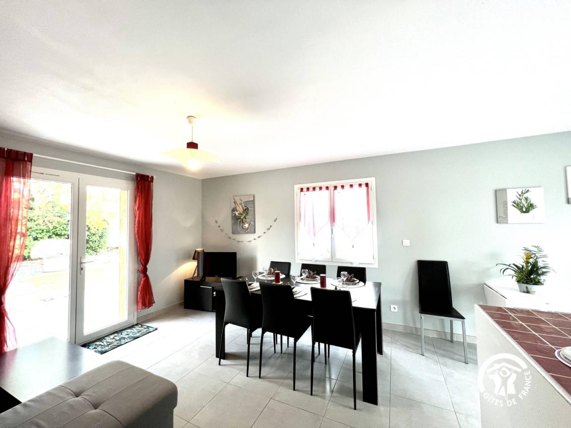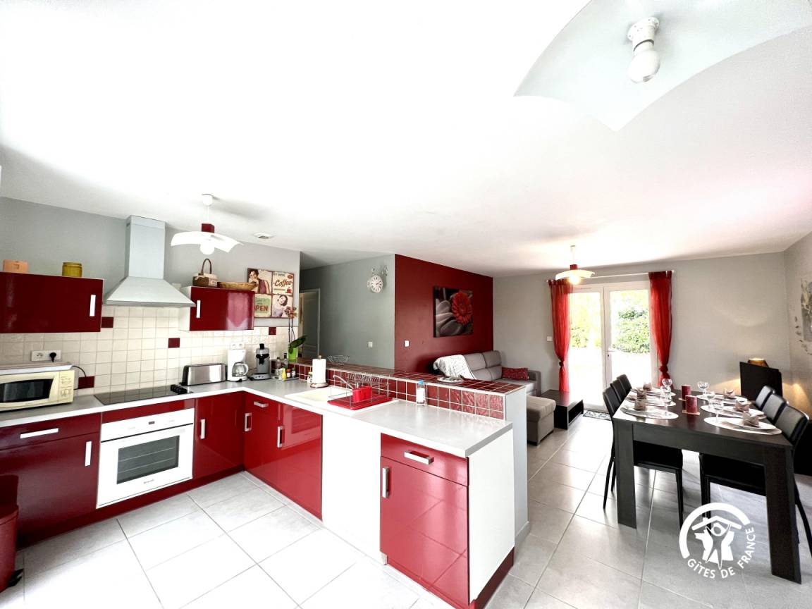 Küche und bar mit Blick auf die Terrasse, Aufenthaltsraum mit TV DVD, 3 Schlafzimmer mit 1 Bett 140 und 4 Betten 90, vorgeschlagene Blätter, SE, wc und 2. wc mit Waschmaschine. Ende des Aufenthalts Anwendung, Elektroheizung, extra Reinigung. Produkte der Wartung zur Verfügung gestellt. Telefon im Haus.