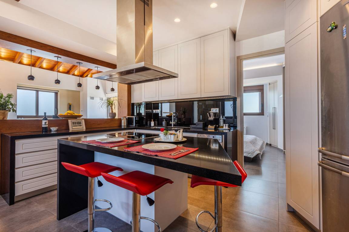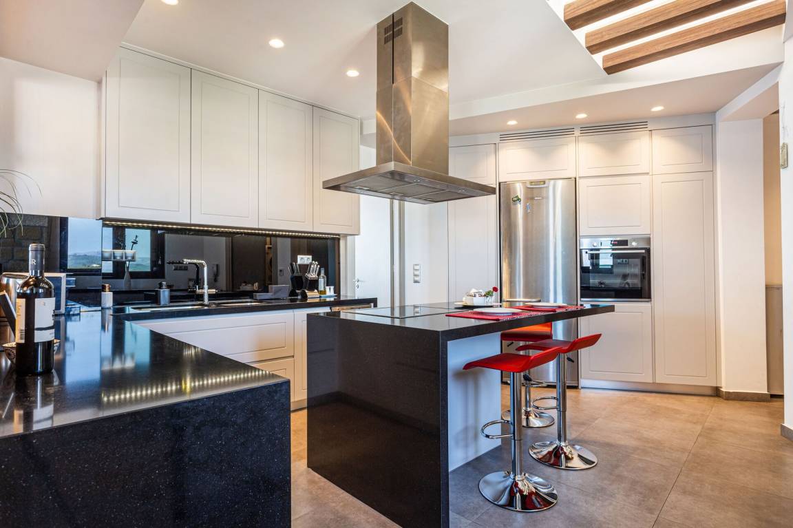 Wohnküche: gut ausgestattete Küche, Esstisch, Spülmaschine, Kühlschrank, Tiefkühler, Mikrowelle, Herd, Ofen, Toaster, Bügeleisen, Amerikanische Kaffeemaschine, Sofa, Kamin, WiFi Internet, Internet, Klimaanlage, Kinderhochstuhl, Satelliten-TV, TV, Ausgang auf den Balkon.