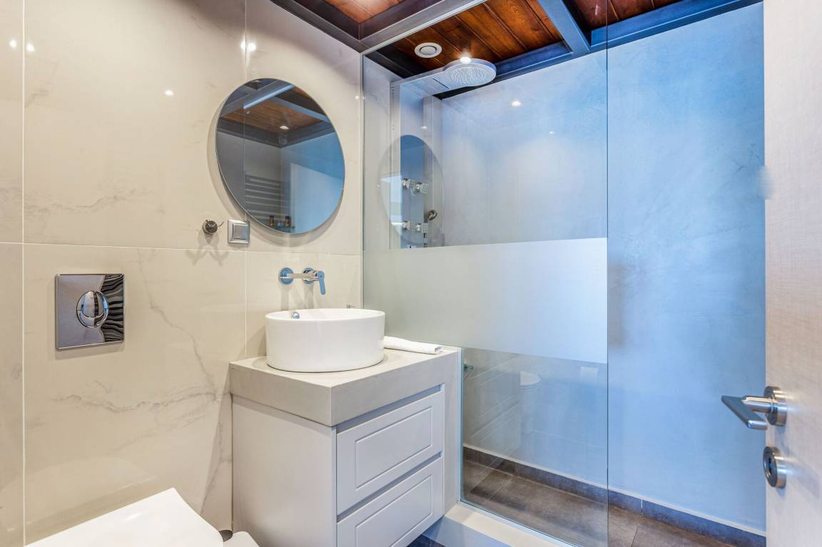 Schlafzimmer mit Bad: Doppelbett, Klimaanlage, Waschbecken, WC, Dusche, Fön.