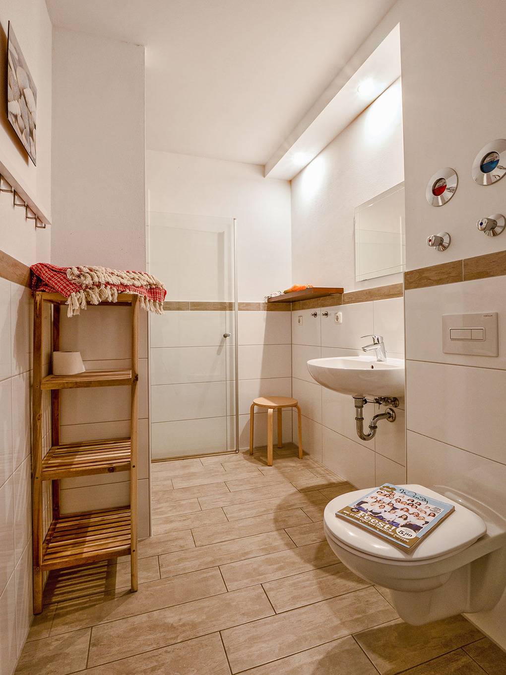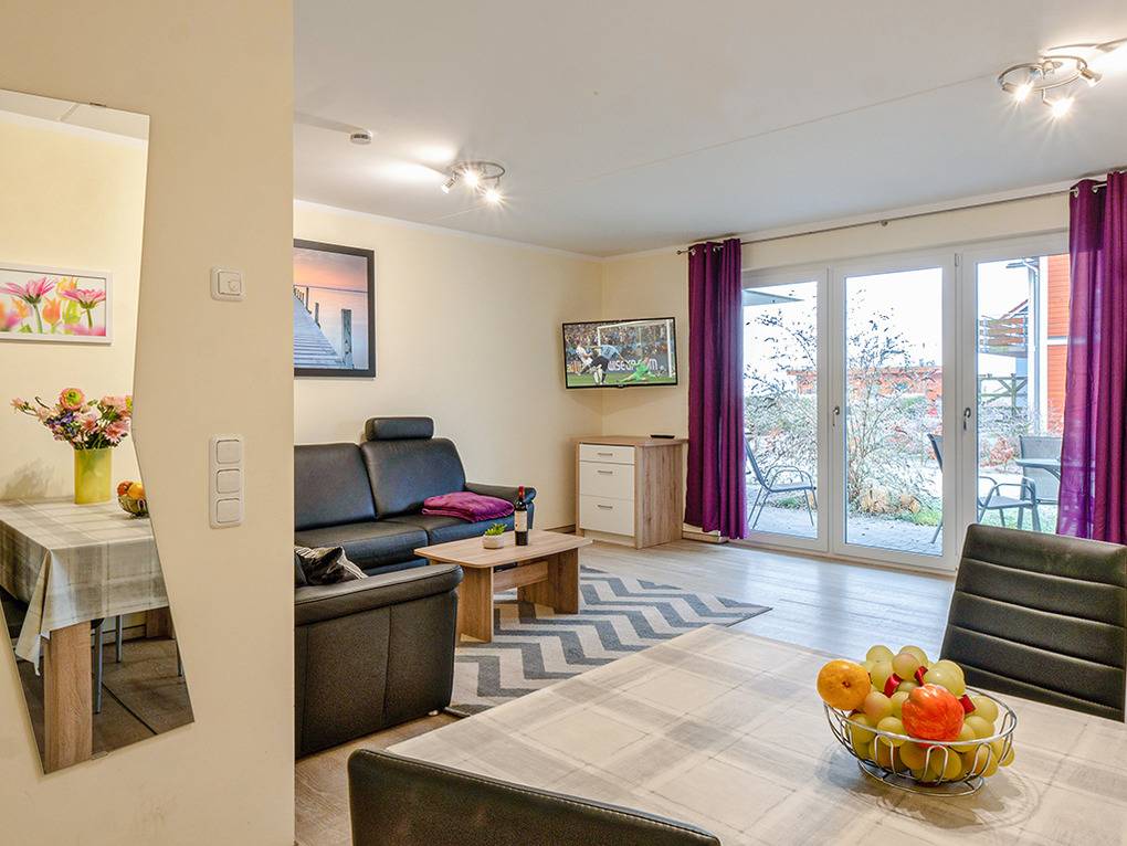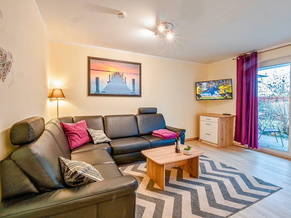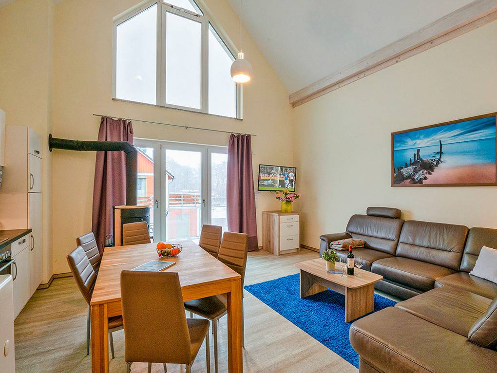 D 47.23 Ferienhaus 4-12 Pers: Reihenhaus als Kombination aus 2 Ferienwohnungen. Es ergibt sich ein 6-Zimmerhaus mit 153 qm Wohnfläche über 3 Etagen. Parterre: Gemütlicher Wohn-/Schlafraum mit Couchgarnitur (Schlafcouch 1-2 Pers.), Flachbild-TV, Esstisch, gut ausgestatteter Einbauküche (Backofen, Mikrowelle, Spülmaschine). Doppelzimmer. Bad: Du, Wb, WC. Terrasse mit Sitzmöbeln. 1. Etage (separater Zugang): Großzügig bis zum Dachgiebel ausgebauter Wohn-/Essraum mit Panoramafensterfront, Couchgarnitur, Flachbild-TV, teils Kaminofen, großem Esstisch, gut ausgestatteter Einbauküche (Backofen, Mikrowelle, Spülmaschine), Balkon mit Sitzmöbeln, Wasserblick. Doppelzimmer. 2-Bettzimmer. Bad: Du, Wb, WC. Vom Wohnraum aus Treppe ins Dachgeschoss (leichte Schrägen): kleine Galerie, offen zum Wohnraum mit Lesesessel. 4-Bettzimmer mit Doppelbett, Schlafcouch (1-2 Pers.), TV. Separates WC, Wb.