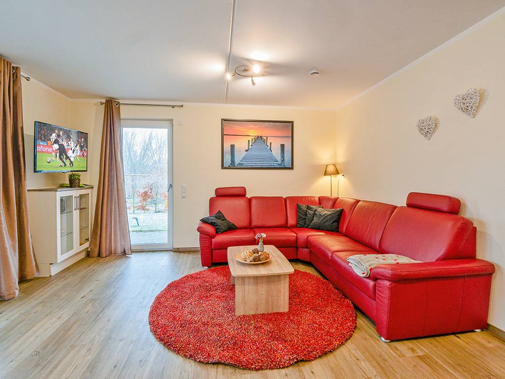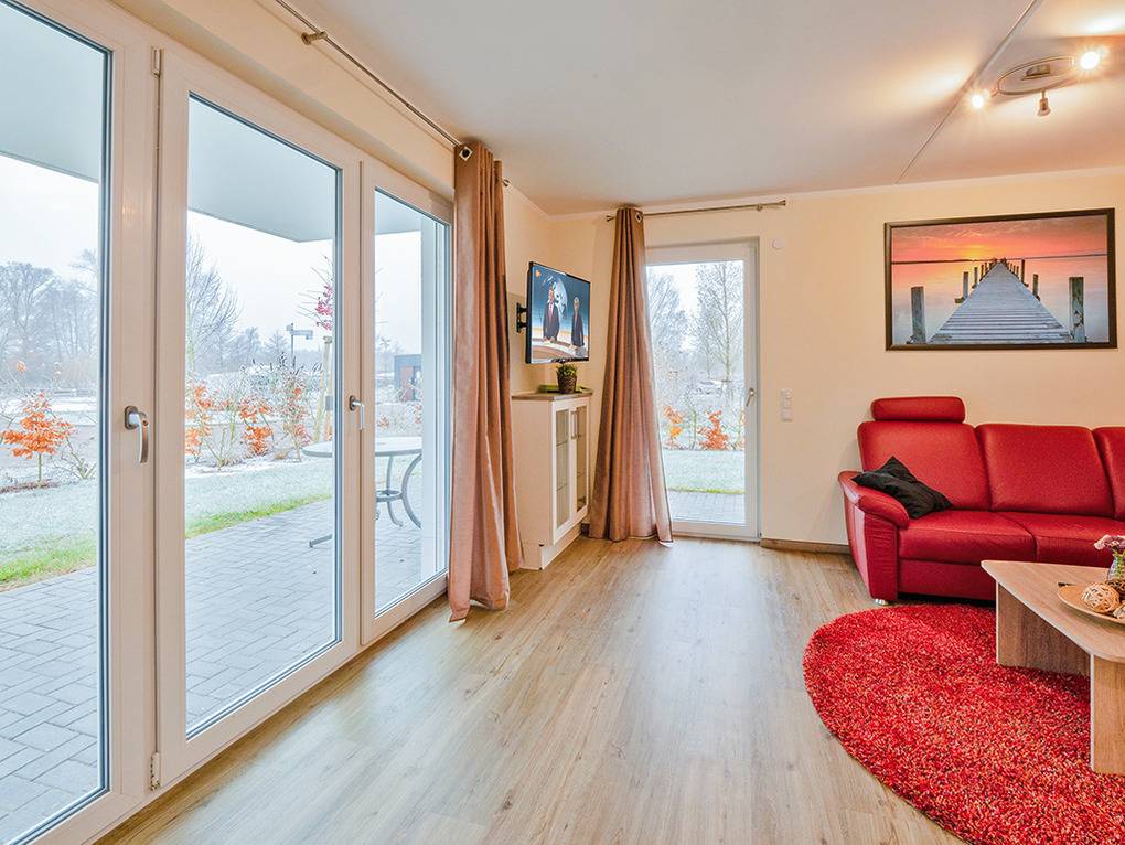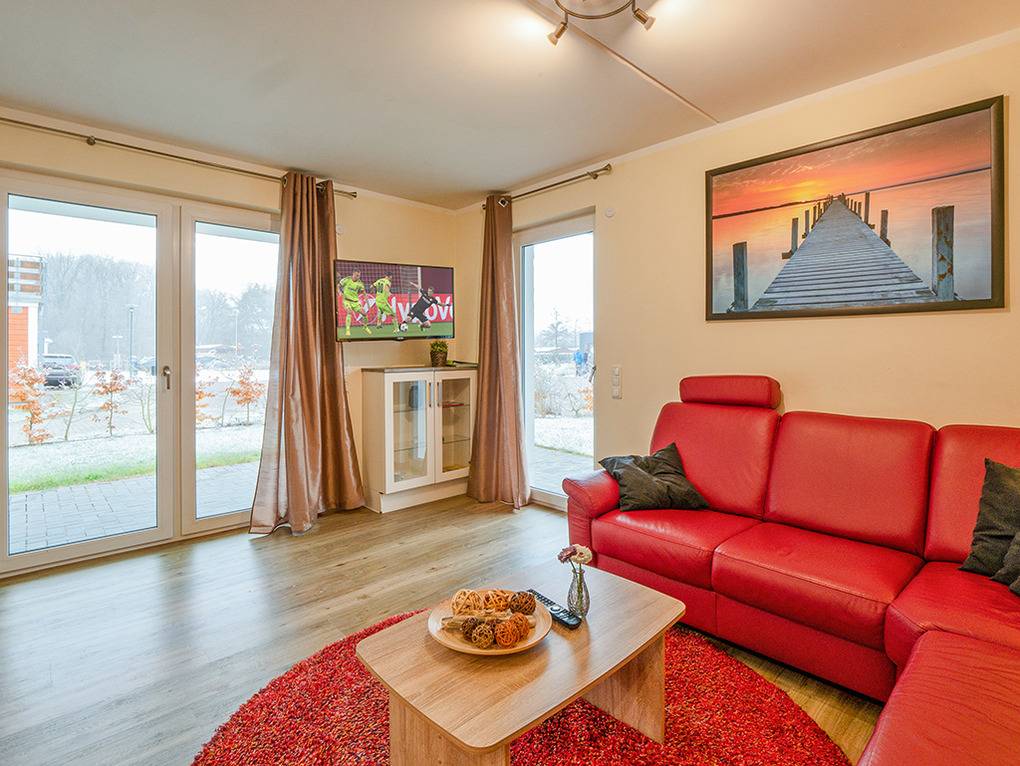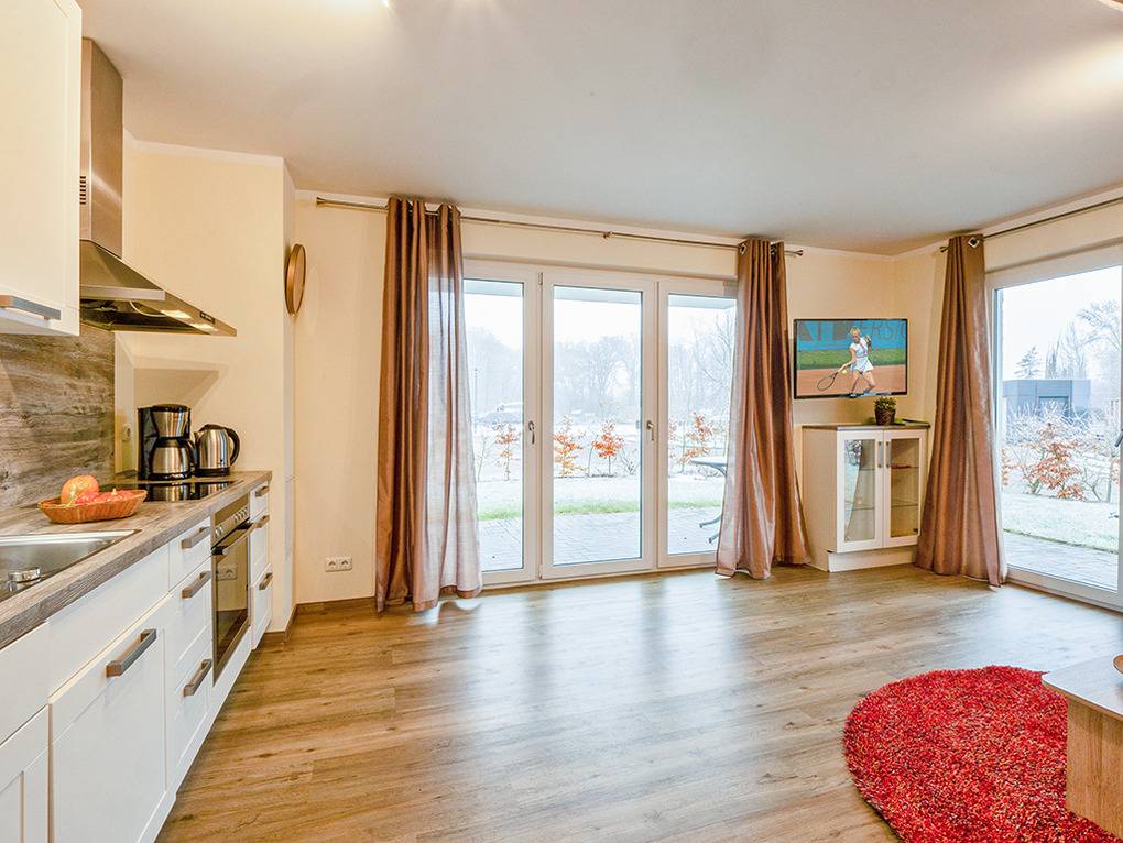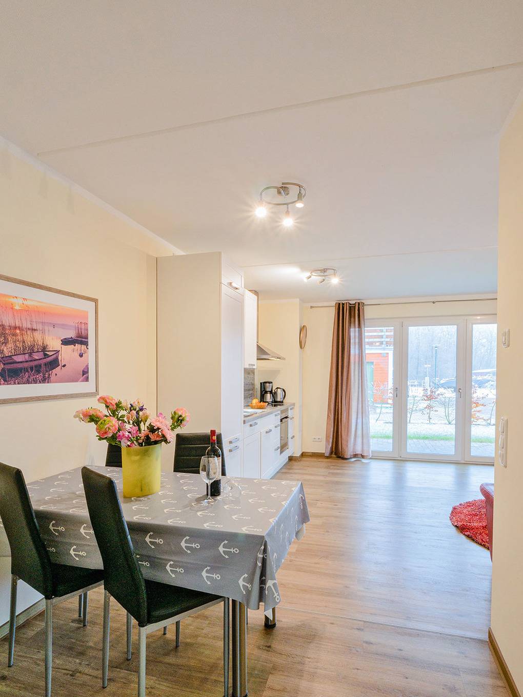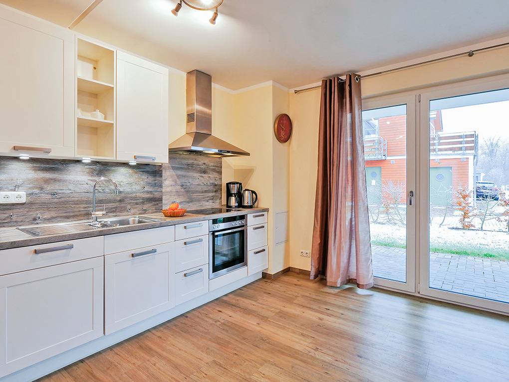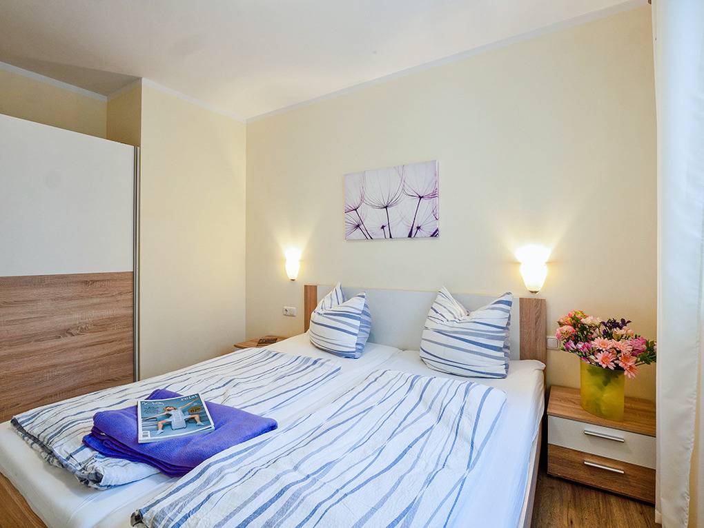 D 47.20 Wohnung 2-4 Pers.: 2-Zimmerwohnung mit 60 qm Wohnfläche, Parterre. Gemütlicher Wohn-/Schlafraum mit Couchgarnitur (Schlafcouch 1-2 Pers.), Flachbild-TV, Esstisch, gut ausgestatteter Einbauküche (Backofen, Mikrowelle, Spülmaschine). Doppelzimmer. Bad: Du, Wb, WC. Terrasse mit Sitzmöbeln, eingeschränktem Wasserblick. Hinweis: Bitte beachten Sie, dass die Schlafcouch nur von einem Erwachsenen oder 2 Kindern genutzt werden kann. Maximale Belegung der Wohnung also durch 3 Erwachsene oder 2 Erwachsene und 2 Kinder.