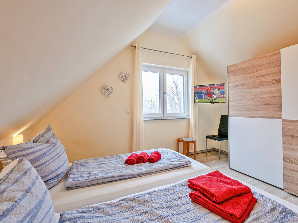 D 47.24 Ferienhaus 4-12 Pers: Reihenhaus als Kombination aus 2 Ferienwohnungen. Es ergibt sich ein 6-Zimmerhaus mit 160 qm Wohnfläche über 3 Etagen. Parterre: Gemütlicher Wohn-/Schlafraum mit Couchgarnitur (Schlafcouch 1-2 Pers.), Flachbild-TV, Esstisch, gut ausgestatteter Einbauküche (Backofen, Mikrowelle, Spülmaschine). Doppelzimmer. Bad: Du, Wb, WC. Terrasse mit Sitzmöbeln. 1. Etage (separater Zugang): Wohn-/Essraum mit Couchgarnitur, Flachbild-TV, großem Esstisch, gut ausgestatteter Einbauküche (Backofen, Mikrowelle, Spülmaschine), Balkon mit Sitzmöbeln, Wasserblick. Doppelzimmer. Bad: Du, Wb, WC. Vom Wohnraum aus Treppe ins Dachgeschoss (leichte Schrägen): Doppelzimmer mit TV. Bad: Du, Wb, WC. 4-Bettzimmer mit Doppelbett, Schlafcouch (1-2 Pers.), Balkon (Sitzmöbel, Wasserblick).