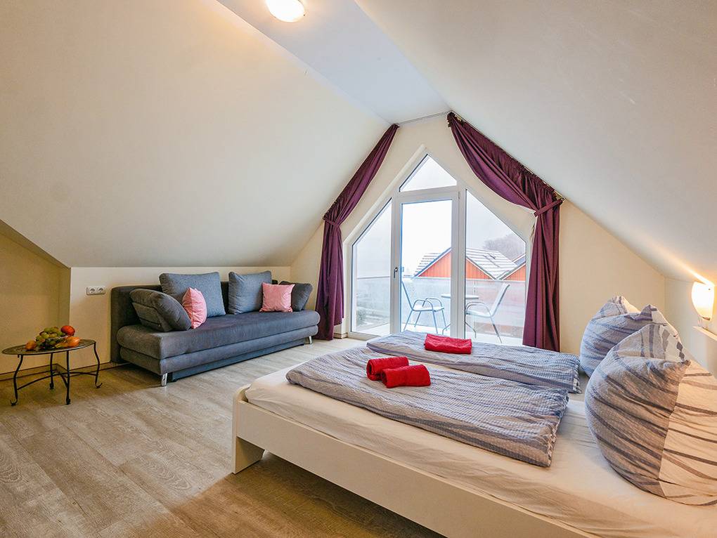 D 47.22 Wohnung 2-8 Pers.: Großzügige 4-Zimmerwohnung mit 100 qm Wohnfläche über 2 Etagen. 1. Etage: Wohn-/Essraum mit Couchgarnitur, Flachbild-TV, Esstisch, gut ausgestatteter Einbauküche (Backofen, Mikrowelle, Spülmaschine), Balkon mit Sitzmöbeln, Wasserblick. Doppelzimmer. Bad: Du, Wb, WC. Vom Wohnraum aus Treppe ins Dachgeschoss (leichte Schrägen): Doppelzimmer mit TV. Bad: Du, Wb, WC. 4-Bettzimmer mit Doppelbett, Schlafcouch (1-2 Pers.), Balkon (Sitzmöbel, Wasserblick).