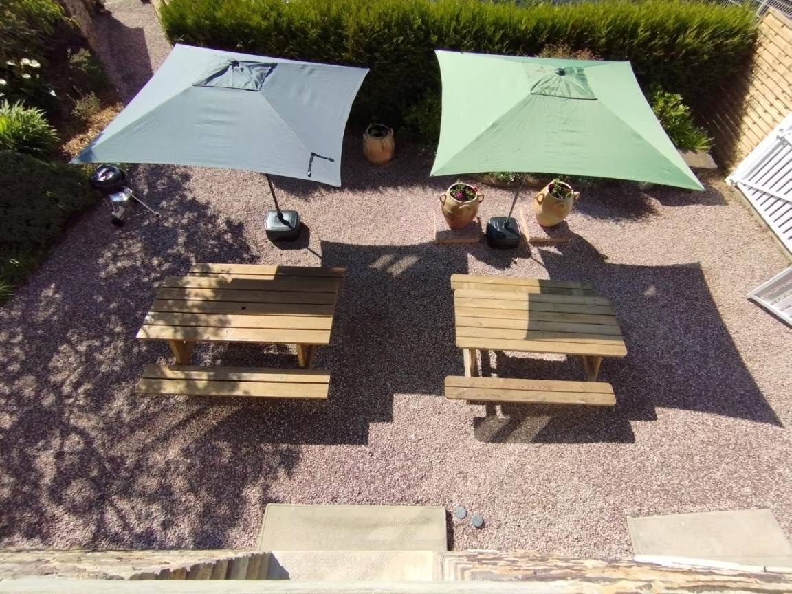 – ein Innenhof mit Picknicktischen, Sonnenschirmen und Grill